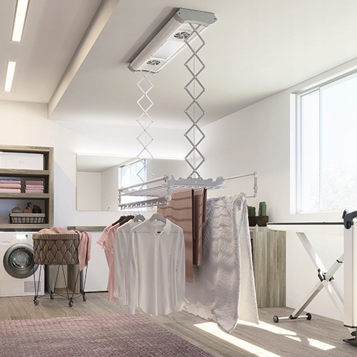 - Foxydry Air можно опустить на высоту до 1,8 м от потолка и фиксируется на любой промежуточной высоте.