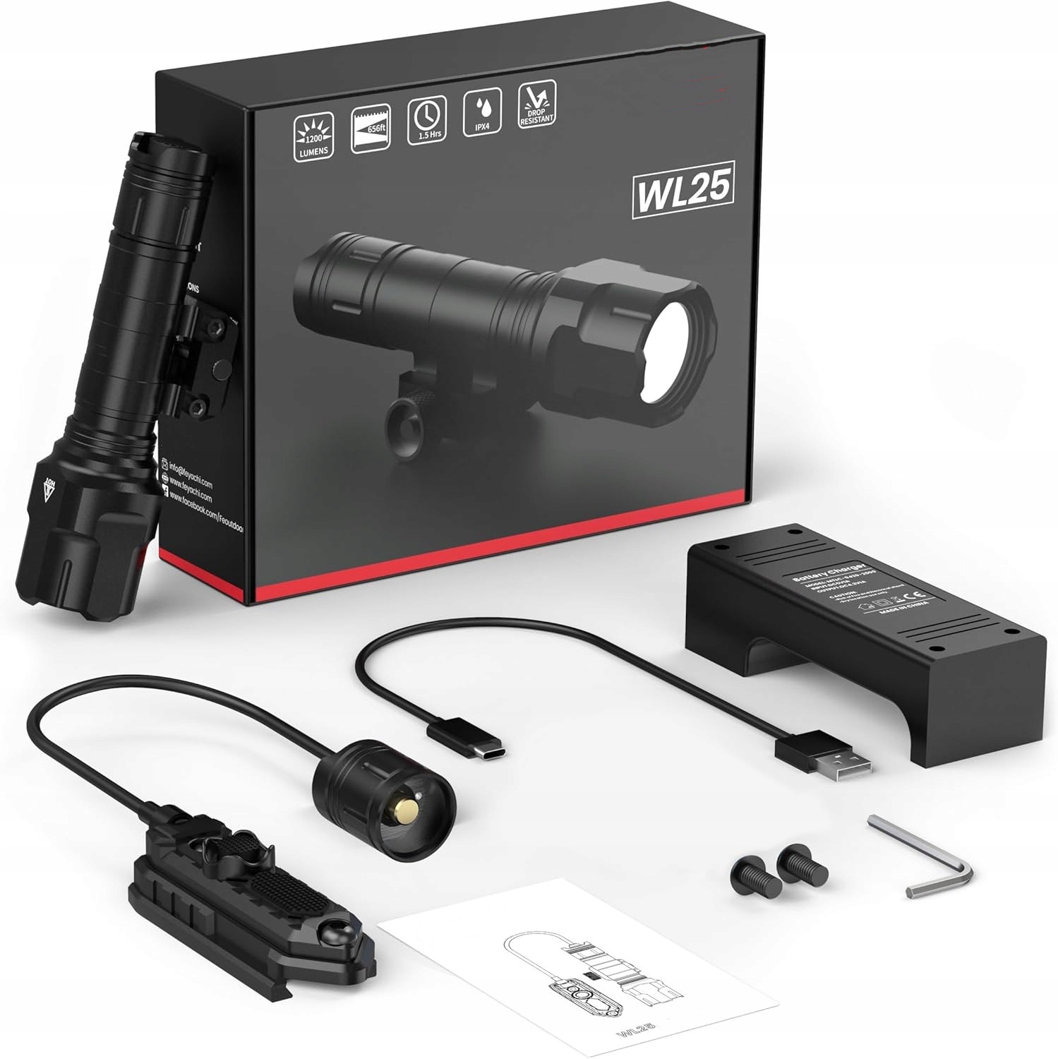 Простая сборка: WL25 Фонарь оснащен специальным кронштейном для крепления на планку Пикатинни, благодаря чему его можно легко установить или снять за несколько секунд. Задний переключатель можно установить на две универсальные направляющие, что позволяет легко выбрать подходящее положение для установки заднего переключателя давления.