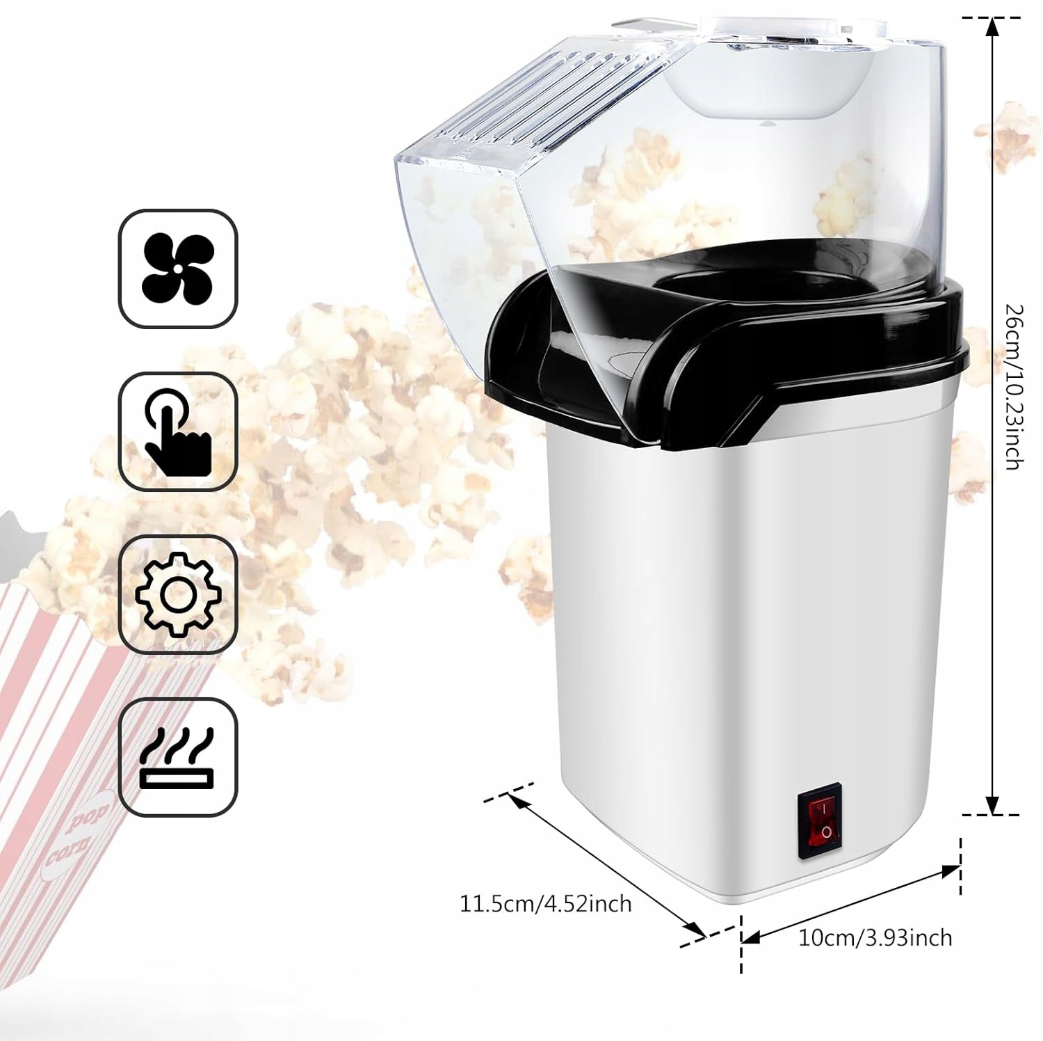 🥤 Благодаря электрическому воздушному выдуванию системы кукурузные бобы нагреваются горячим воздухом, что заставляет их взломать. Благодаря этому вы можете наслаждаться свежим попкорном в течение 2-3 минут.