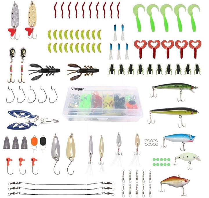 Предложение включает в себя 120 различных видов приманки и аксессуаров для рыбалки, различные с точки зрения типа, включая твердые и мягкие приманки. Прозрачная коробка облегчает поиск рыболовного оборудования. Он имеет отдельные и упорядоченные отсеки для хранения различных аксессуаров.