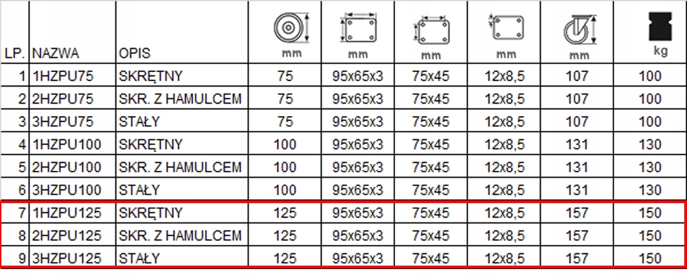 Комплект состоит из четырех колес, оснащенных пластинчатым креплением. В комплект входят два фиксированных комплекта код 3HZPU125K2 (позиция 9 в таблице), одно поворотное колесо с тормозом код 2ZLPU125K2 (позиция 8 в таблице) и одно колесо поворотное с кодом 1HZPU125K2 (позиция 7 в таблице).