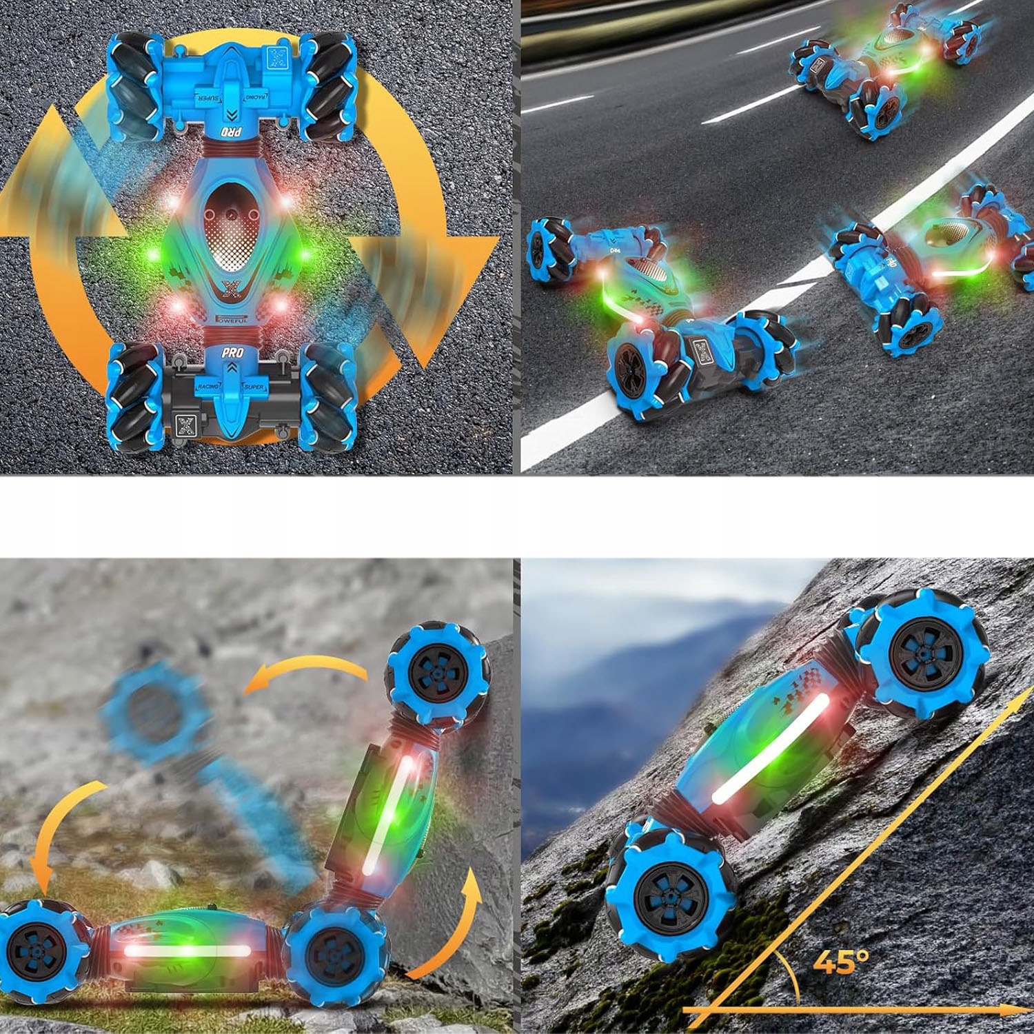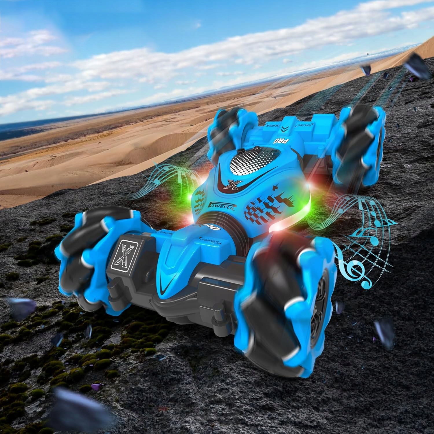 Каскадерские машины с дистанционным управлением, распознающие жесты, и технологией защиты от помех 2,4 ГГц поддерживают совместные гонки нескольких автомобилей. Оснащенный мощными двигателями и роликовыми шинами, внедорожник и дорожная машина с дистанционным управлением легко преодолевает различные местности. Обеспечивает всем идеальные впечатления от гонок.