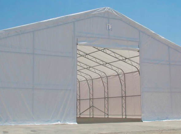 Конструкция, брезент, двускатная стена с большими воротами и входом для людей.