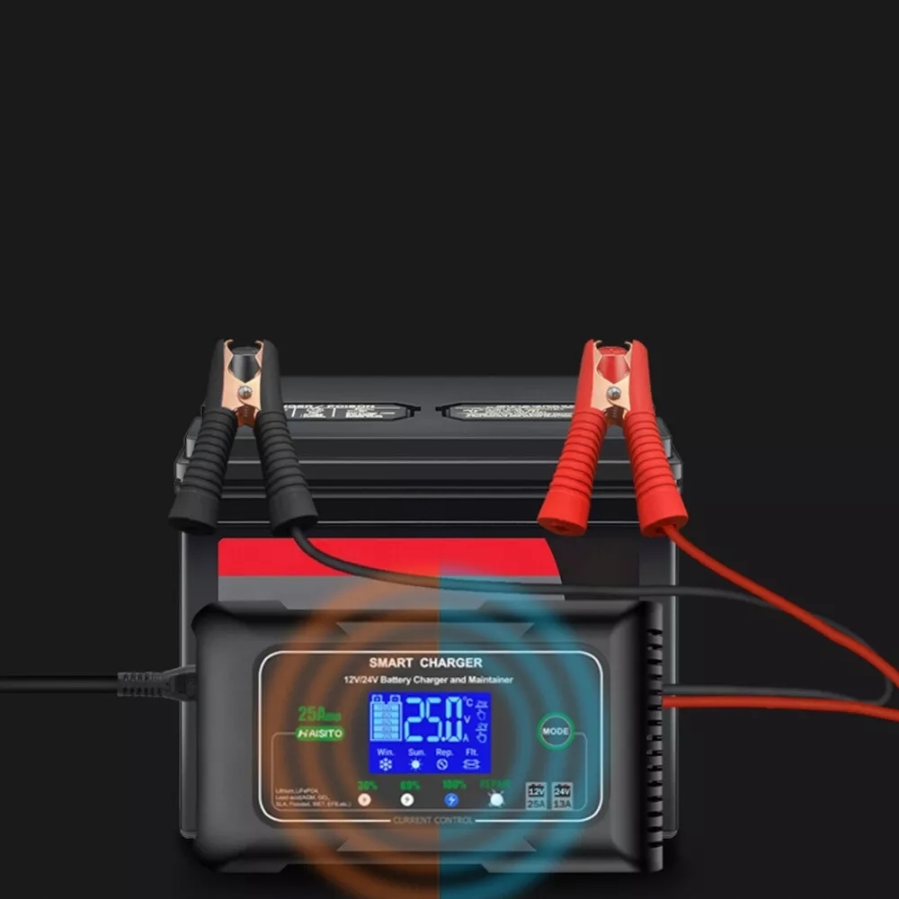 【Запуск одной кнопкой】Зарядное устройство аккумулятора 12 В 25 А, 24 В 13 А с четырьмя режимами запуска одной кнопкой, максимальный зарядный ток составляет 25 А, что обеспечивает быструю зарядку аккумулятора. Использование пружинных кнопок вместо сенсорных кнопок значительно продлевает срок службы зарядного устройства.