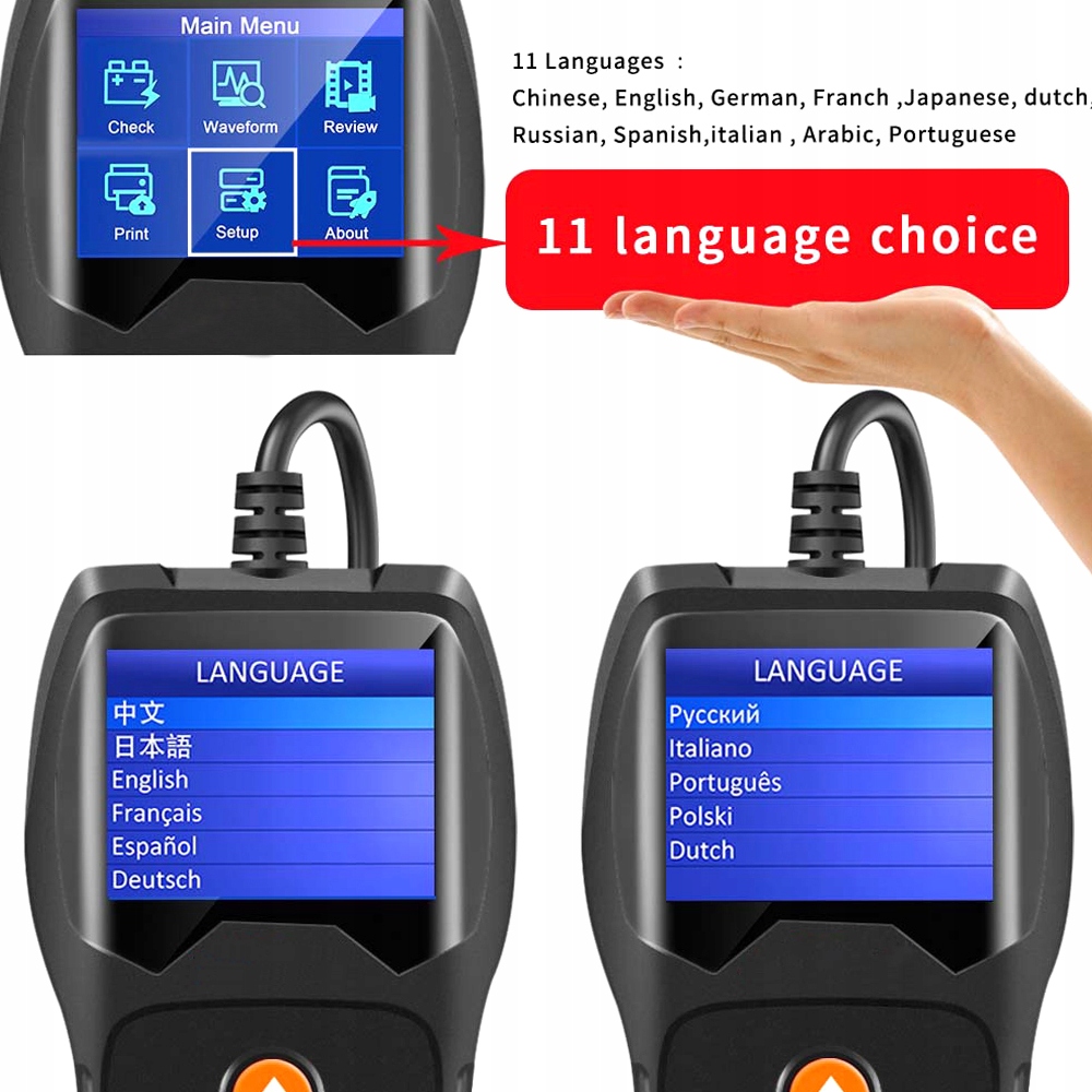12 доступных языков, включая польский (английский, испанский Немецкий, французский, итальянский, русский, португальский, голландский, японский, китайский, корейский). li> Напряжение аккумулятора и тесты на тестирование батареи
