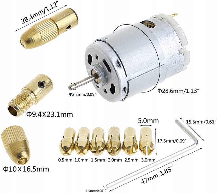 Набор, состоящий из электродвигателя 12В, мехового держателя и 6 гильз для сверл диаметром 0,5мм 1,0мм 1,5мм 2,5мм 3,0мм. Этот набор представляет собой штатную мини-микродрель, т. е. без блока питания и корпуса. Предлагаемый набор идеально подходит для начинающих любителей, которые хотят создать свой собственный инструмент для сверления отверстий в таких материалах, как печатные платы, печатные платы, платы ABS, алюминиевые листы, картон, фанера и т. д. Это ручная дрель, предназначенная для точной работы.