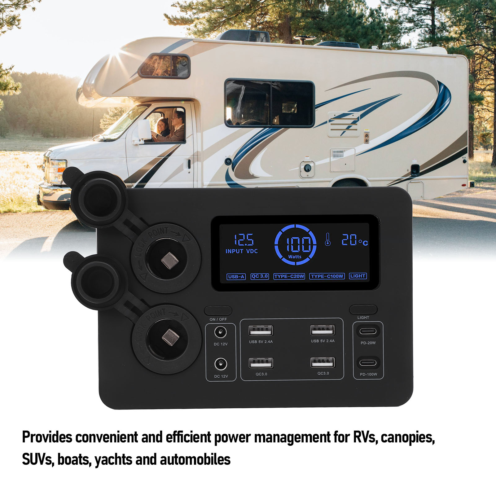1. Эффективное управление энергией: Mini Power Box 12V имеет созданный ЖК -дисплей и порт USB C QC3.0, обеспечивающий удобное и эффективное решение для управления энергопотреблением для RV, Awnings, Suvs, ветвей, яхт и автомобилей.
