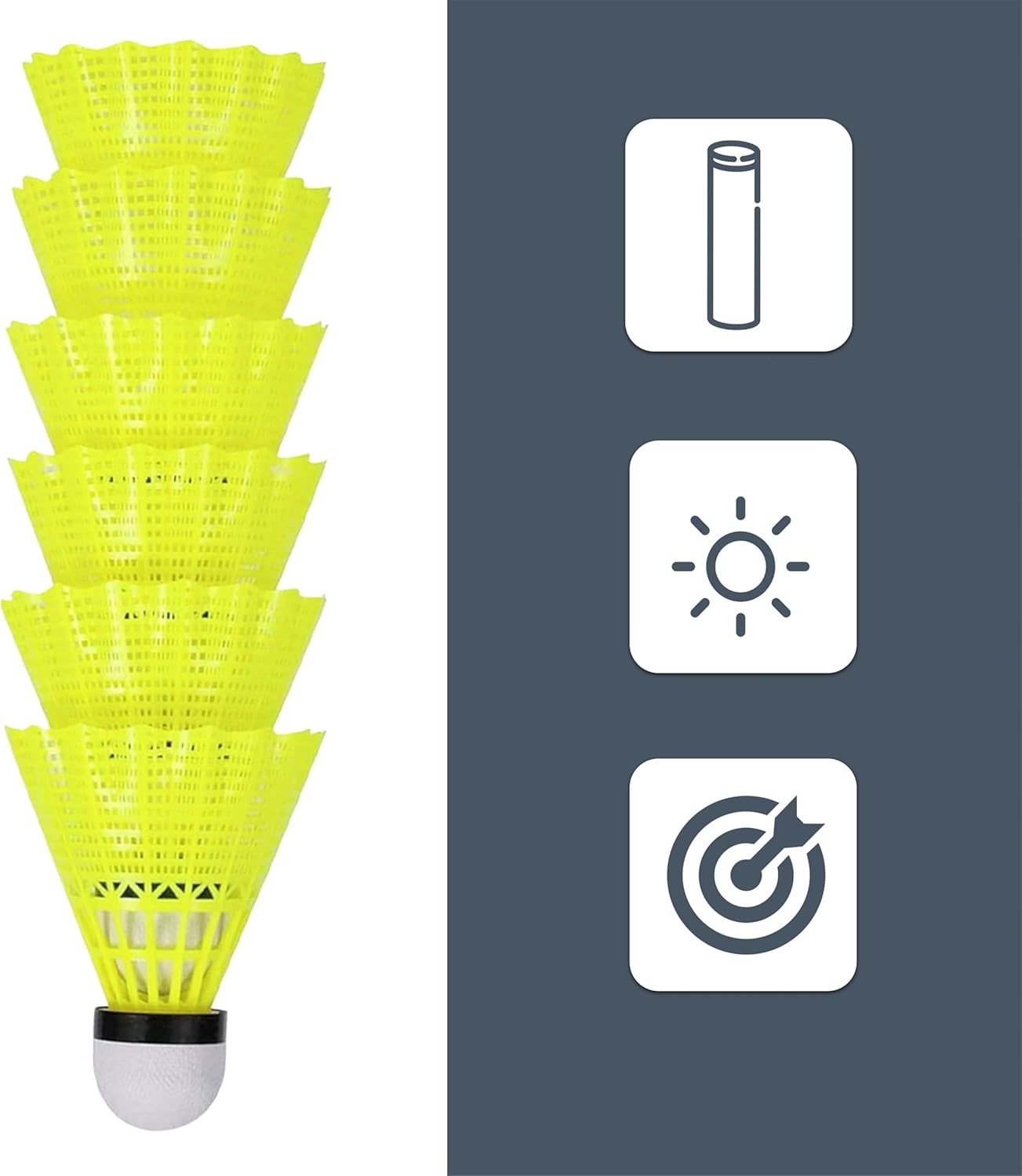 Ярко -желтый цвет делает шаттлы идеально видимыми на небе, траве или зале. Это облегчает игру и улучшает рефлексы