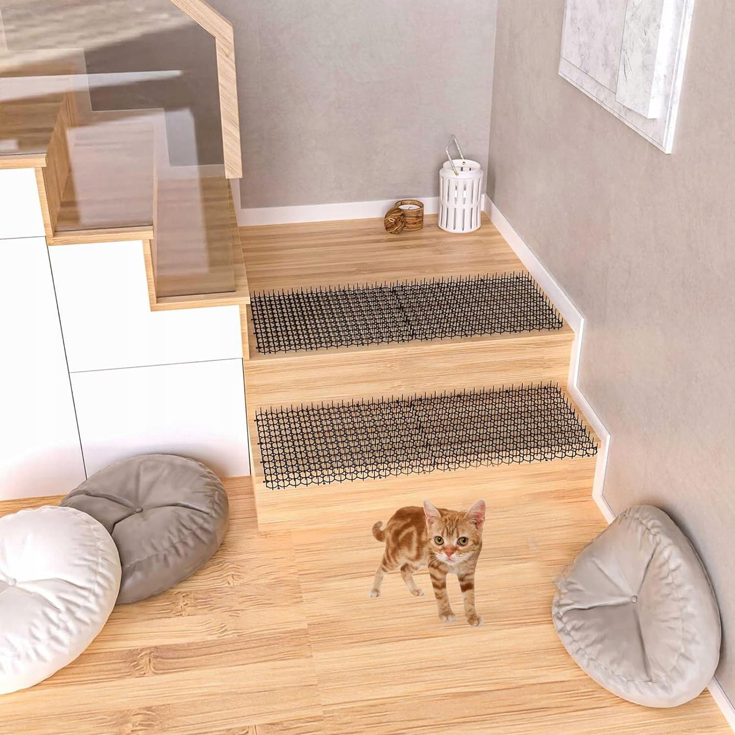 🐈 Простая установка. Сетку с шипами можно легко закрыть и установить в любом месте. 8 U-образных анкеров крепят кошачий коврик к земле. При необходимости можно ножницами отрезать клейкую полоску до нужного размера и использовать, это очень практично.