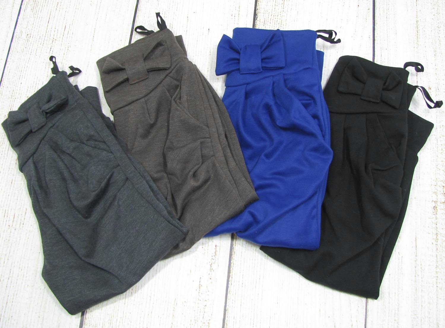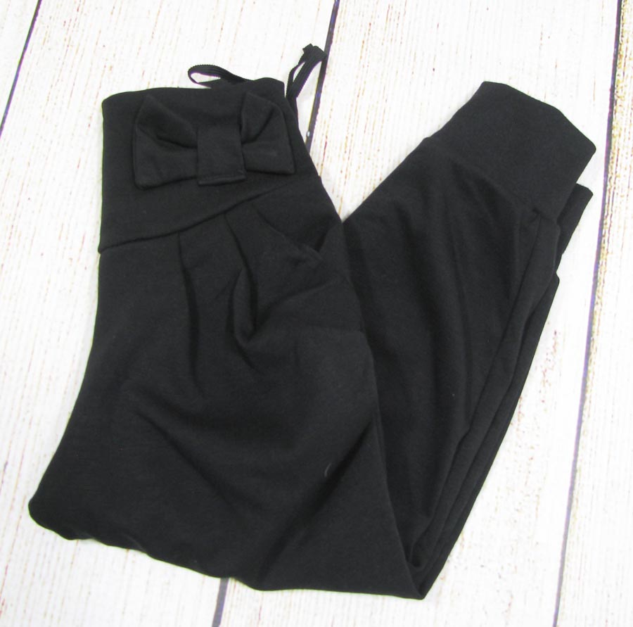 Новые, отличные брюки для девочек черного цвета. Широкий пояс, украшенный бантом. Брюки имеют два открытых кармана и сборку спереди. Ножки отделаны манжетами. Товар отличного качества, очень красиво сшит, новый, с бирками, высшего качества. Идеально подходит для повседневного использования.