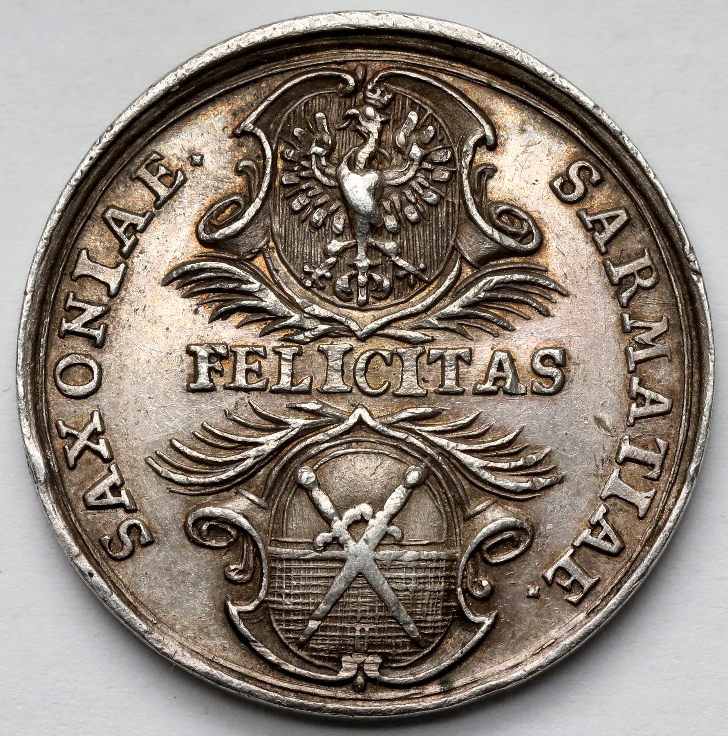 Реверс: два герба (Польша и Саксония) с надписью FELICITAS (счастье). между . Окружён САРМАТИЯМИ. SAXONIAE.