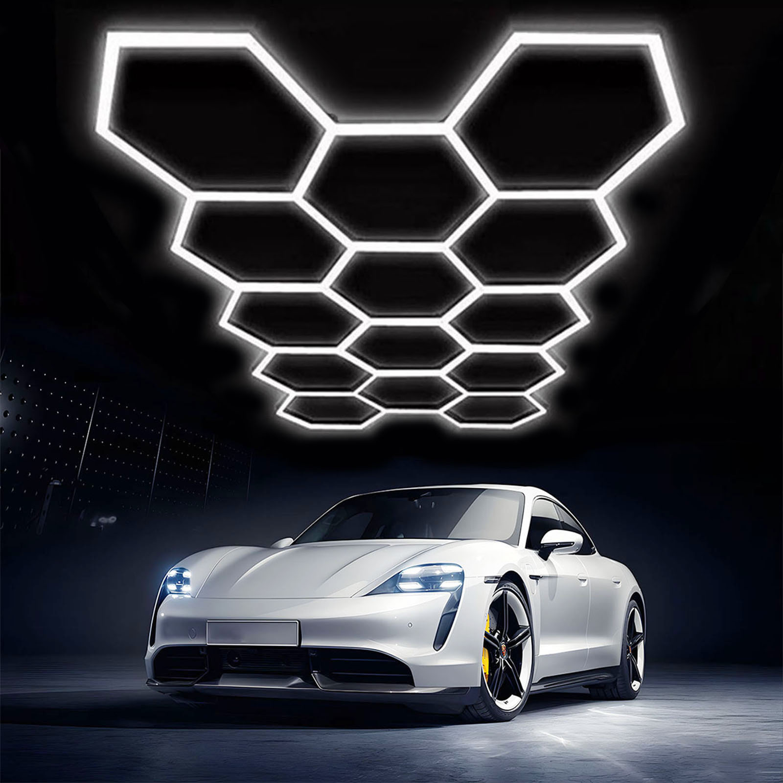 Эти гаражные огни могут обеспечить цвет света и яркости 6500 К и 62080 лм всего за 520 Вт, благодаря которой ваш гараж или магазин выглядит очень ярко, и в то же время больше энергии. Он состоит из 57 световых труб (14 шестигранных огней). Вдохновение дизайна происходит от стабильной и простой сотовой структуры.