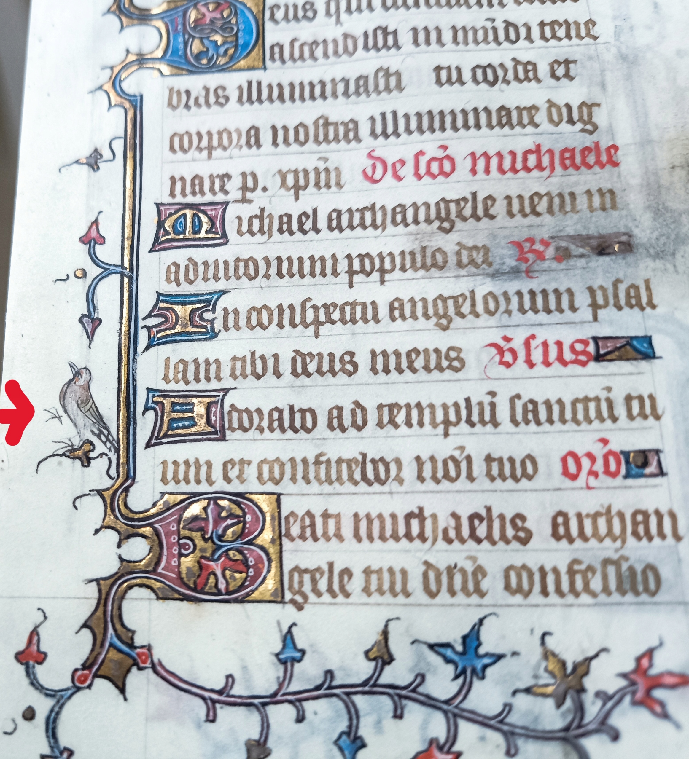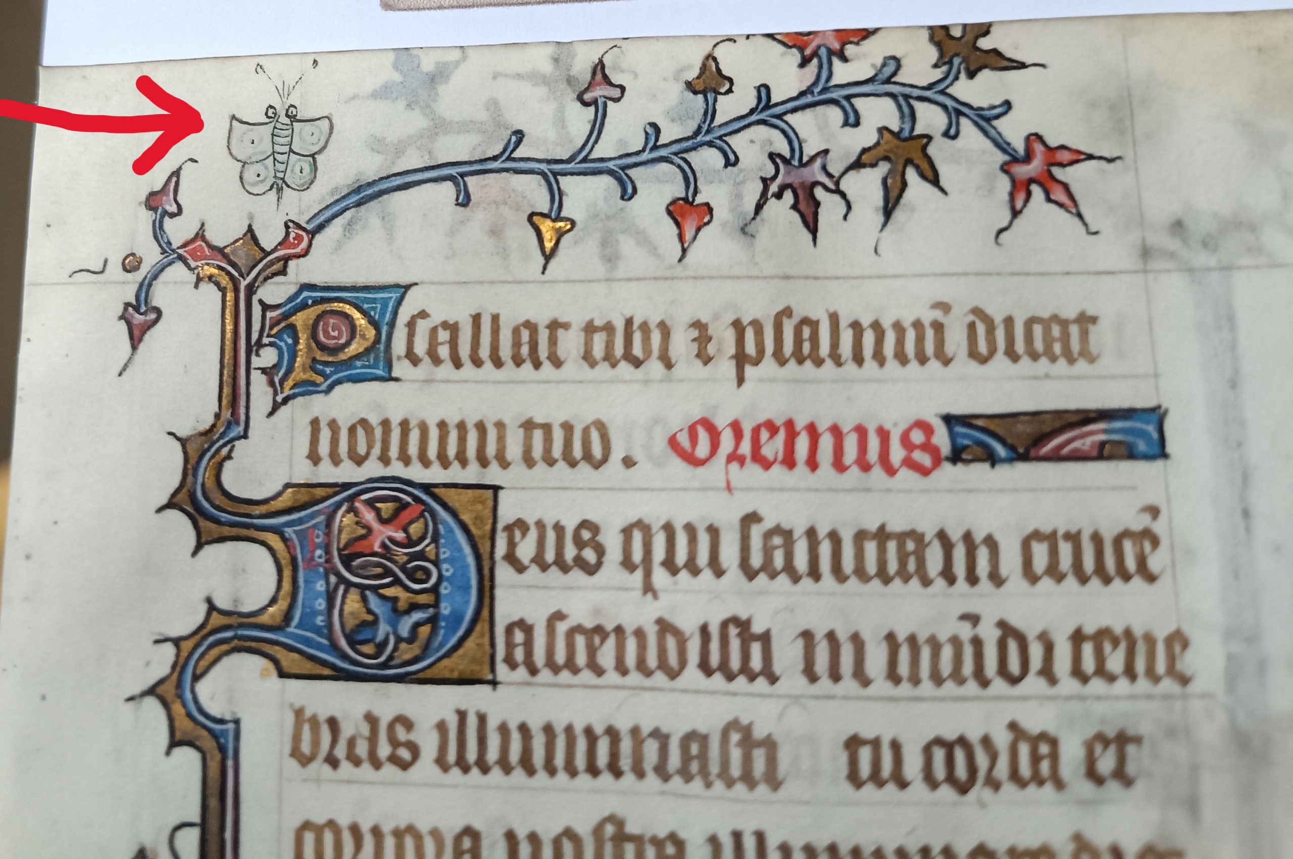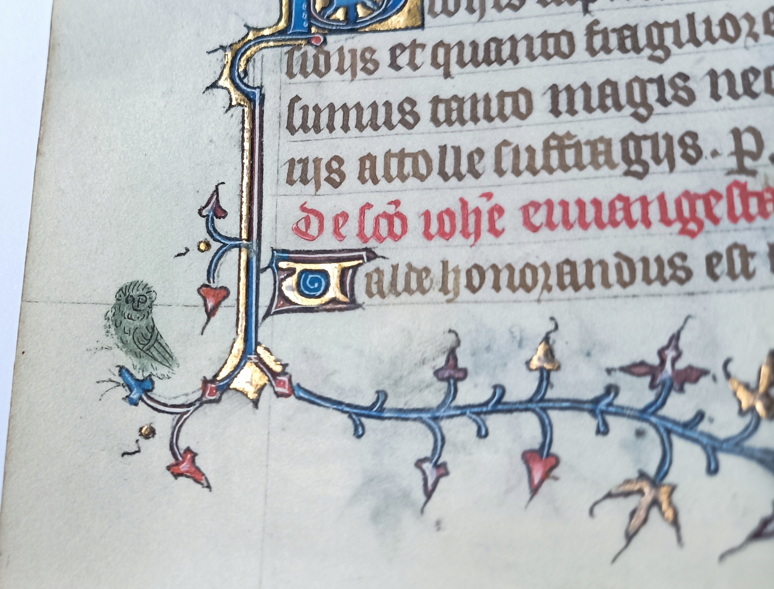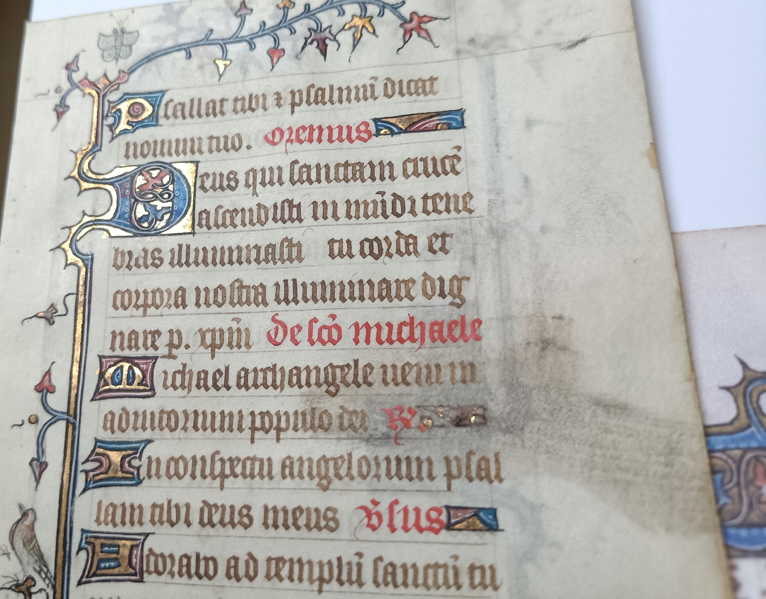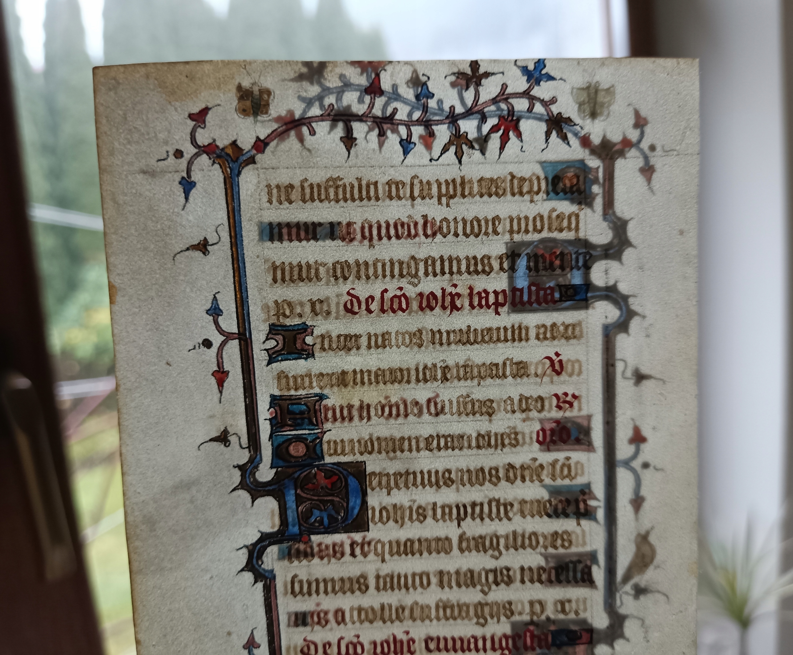 Страница пергамента, содержащая фрагмент так называемых молитвенных часов, датируется примерно 1450 годом, из Франции. Латинский текст написан типичным для того времени готическим шрифтом на изящном, нежном пергаменте. Книга имела удобный формат (размер карточки примерно 14 х 9,5 см), предназначалась для личной молитвы и являлась предметом роскоши. В тексте содержится фрагмент Ветхого Завета, это книга Псалмов, Псалом 138.