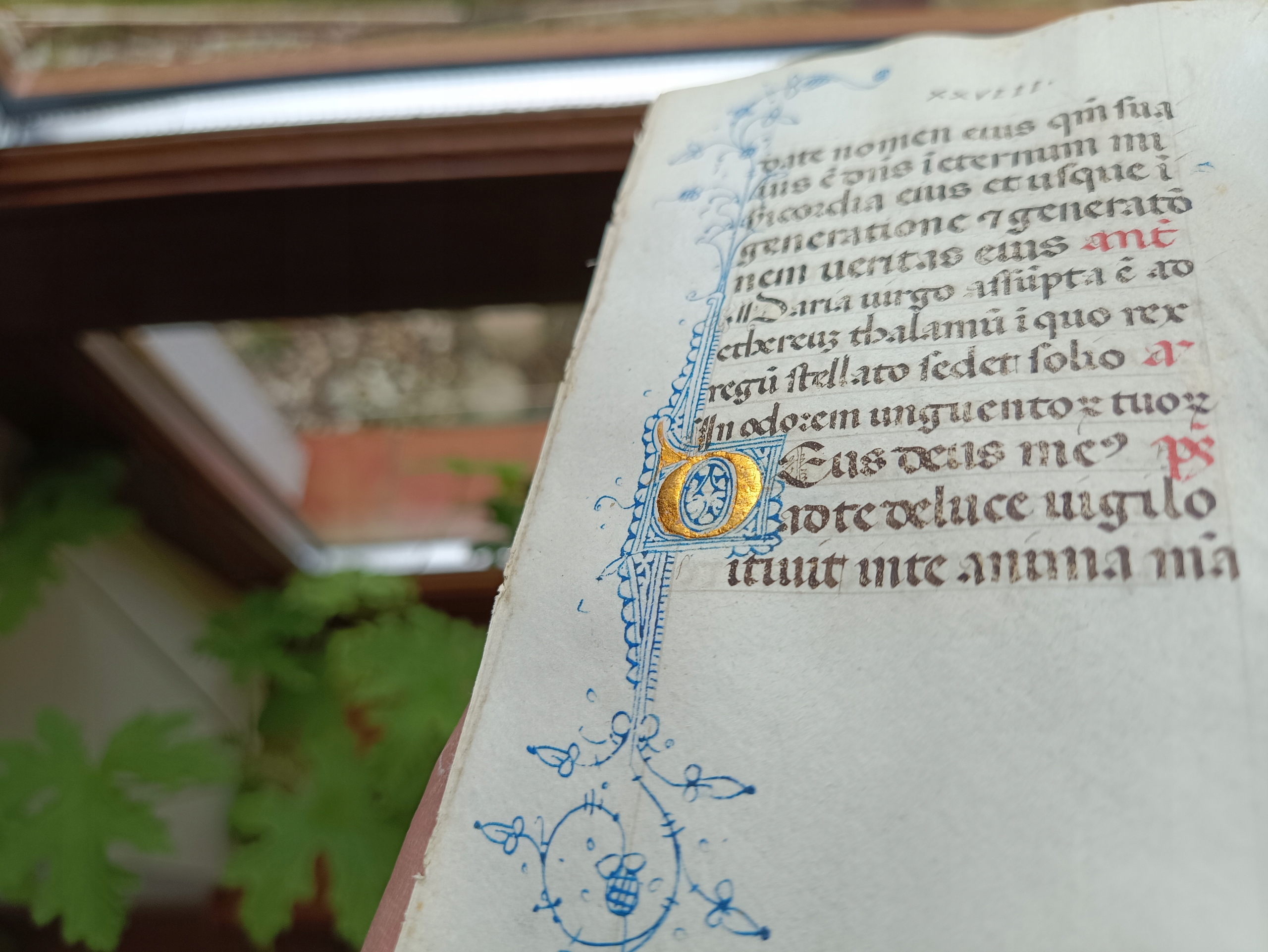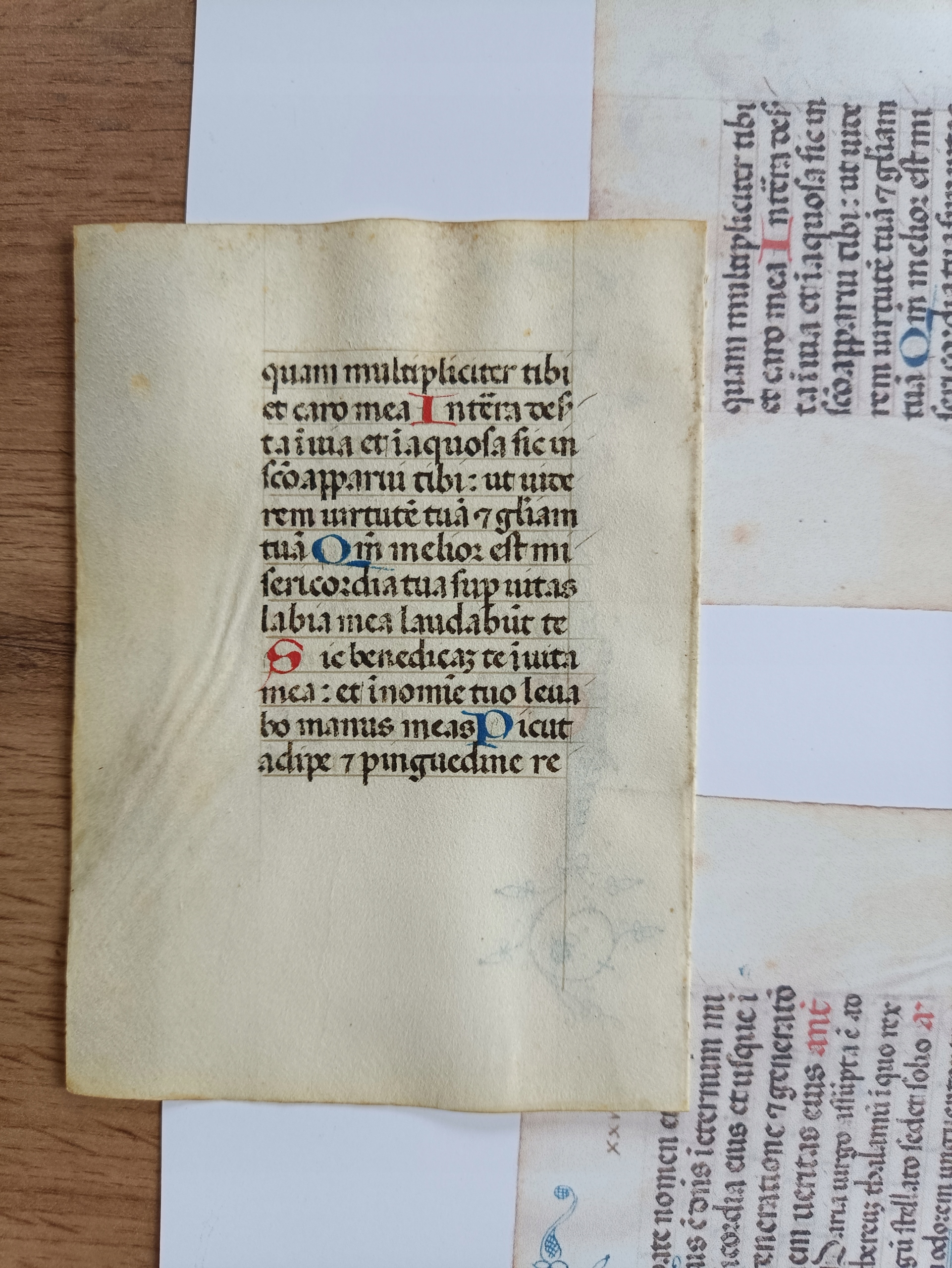 Пергаментная карточка с фрагментом Часослова. Родом она из северной Италии (Ломбардия), около 1450 года. На карточке присутствуют фрагменты 100-го псалма и Марианской молитвы, написанные на латыни типичным для того времени готическим шрифтом на тонком пергаменте. Книга имела удобный формат (размеры карточки примерно 12,9 см х 9,2 см), использовалась для личной молитвы, была предметом роскоши.