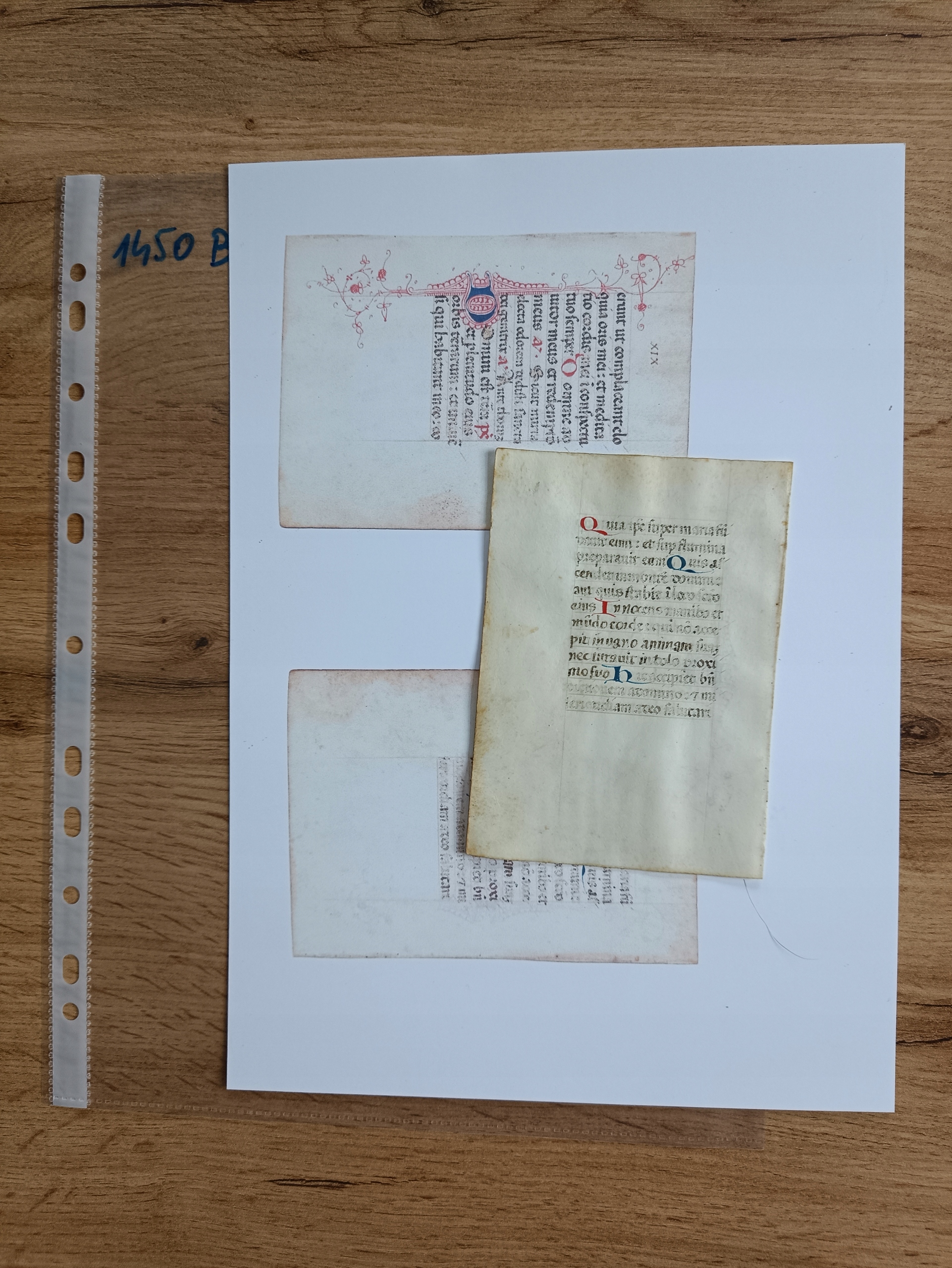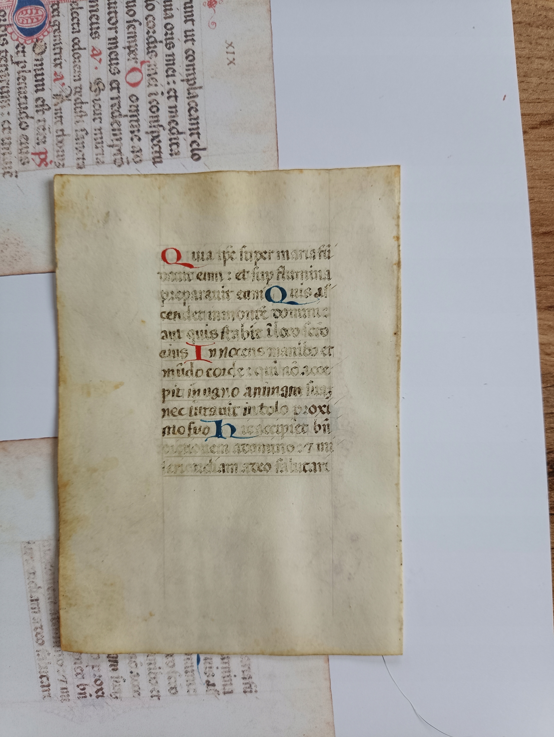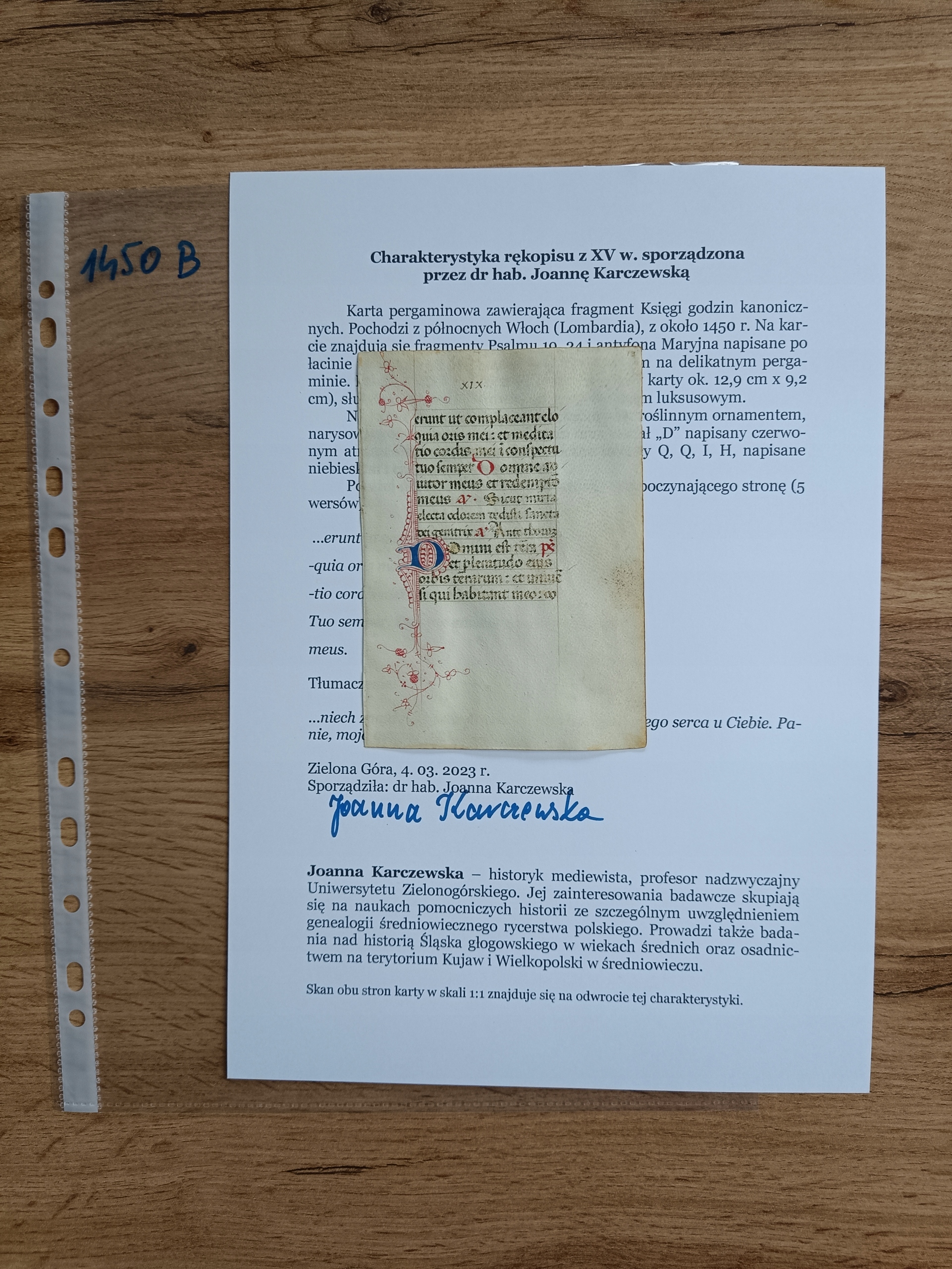 Пергаментная карточка с фрагментом Часослова. Происходит из северной Италии (Ломбардия), около 1450 года. На карточке присутствуют фрагменты Псалма 19, 24 и антифона Марии, написанные на латыни типичным для того времени готическим шрифтом на тонком пергаменте. Книга имела удобный формат (размеры карточки примерно 12,9 см х 9,2 см), использовалась для личной молитвы, была предметом роскоши.
