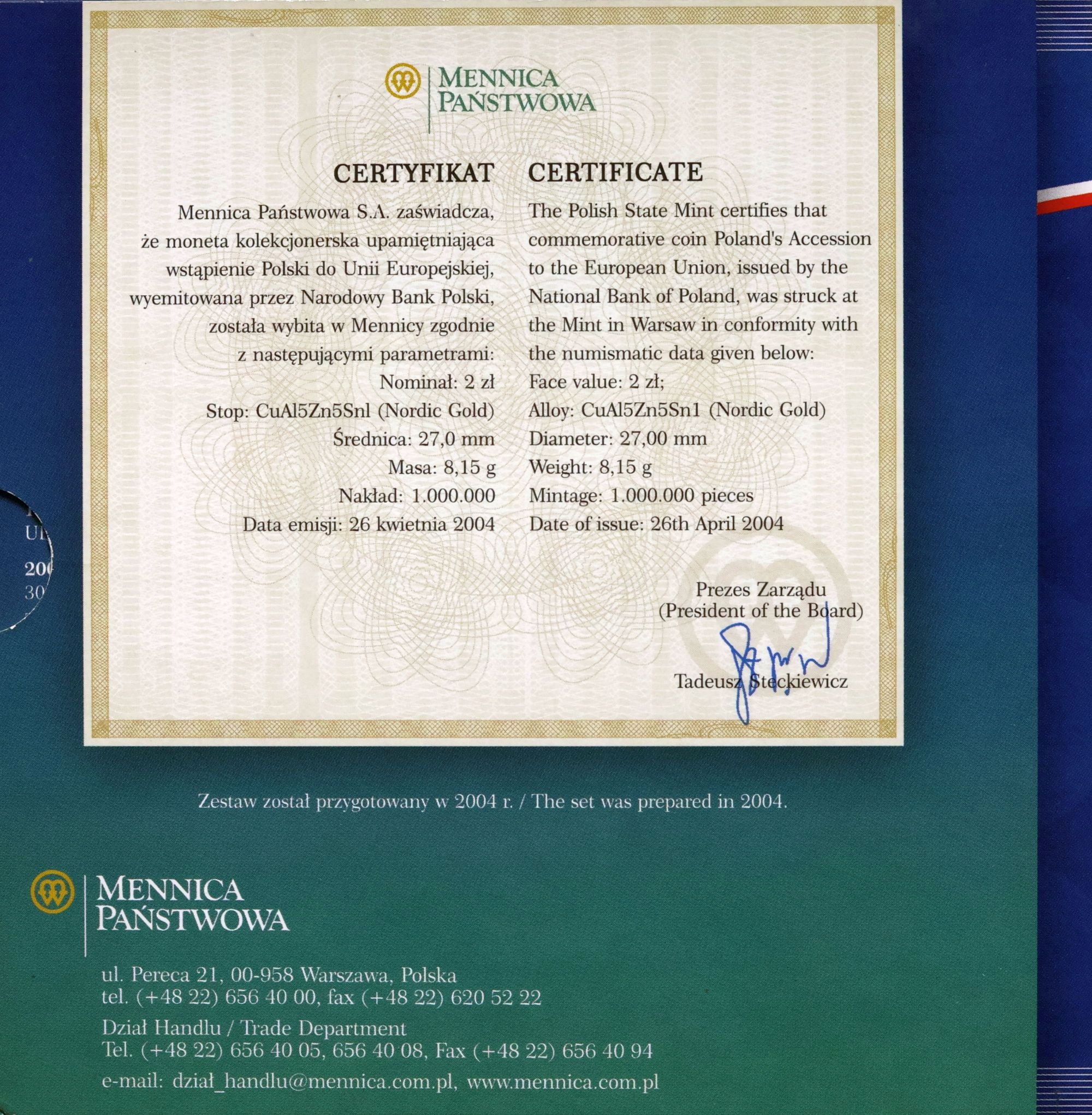 15, Польща, ІІІ Посполита, Набір обігових монет + 2 злотих. Приєднання до Союзу