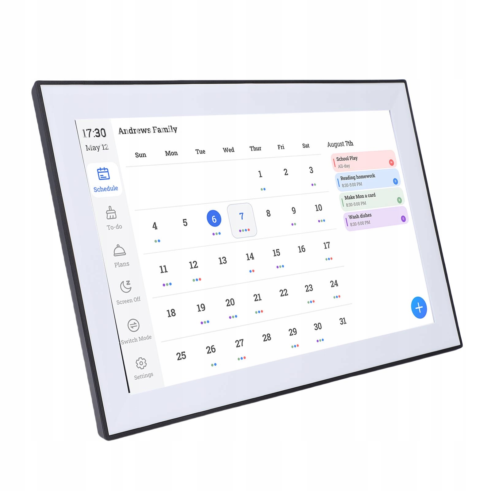 1. Na Smart Calendar: Цифровой календарь положит конец вашей хаотичной жизни. Созданный для занятых семей, он поможет вам организовать свою жизнь и адаптировать ее к потребностям вашей семьи. Подключайтесь к Wi-Fi 2.4 5G, назначайте цвета членам семьи и различайте личные события.