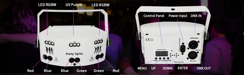Красные, синие, зеленые световые лучи и красочный фоновый дисплей RGBW 125 ярких и красочных комбинаций рисунков, высокоточная обработка рассеяния и хорошая светопередача, прохладное освещение в сочетании с тремя стили режимов голосового управления. Меняйте цвета в такт музыке, танцуйте под прекрасным светом сцены и наслаждайтесь прекрасной вечеринкой с друзьями, семьей, возлюбленными и партнерами по танцам.