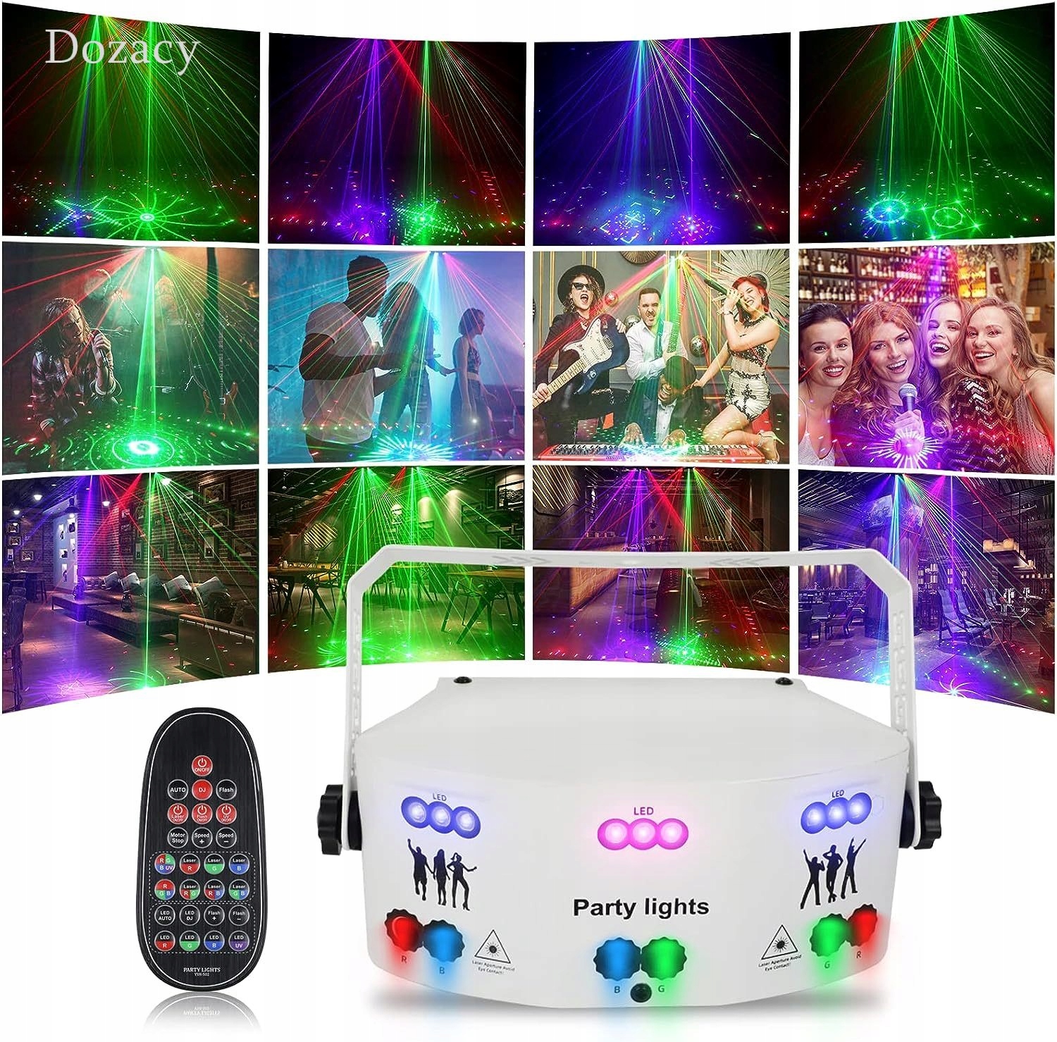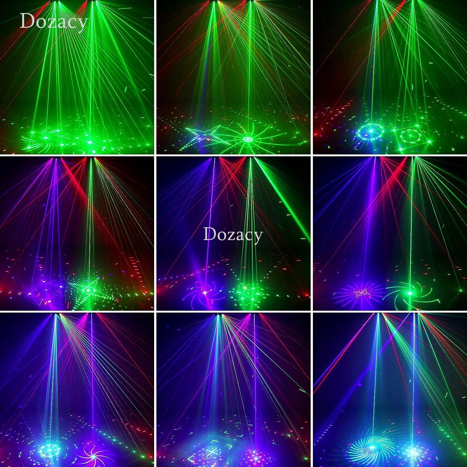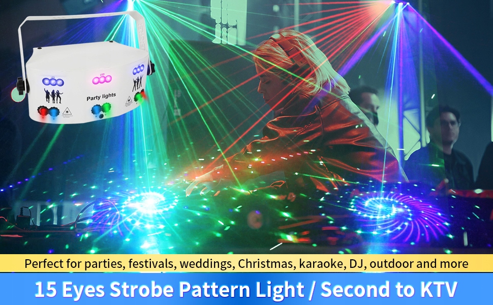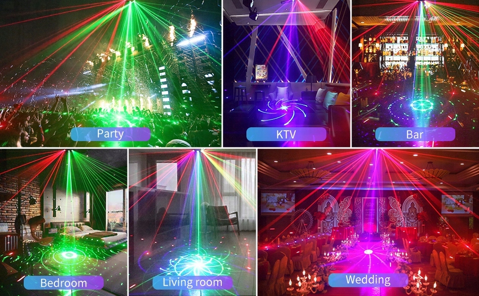Источник света: огни DJ-вечеринки имеют красные, синие, зеленые лучи и красочный фон RGBW, могут отображать 125 ярких и красочных комбинированных рисунков, с высокочувствительным датчиком голосового управления, рисунком, цветом и эффектом луч может меняться вместе с ритмом. Музыка
