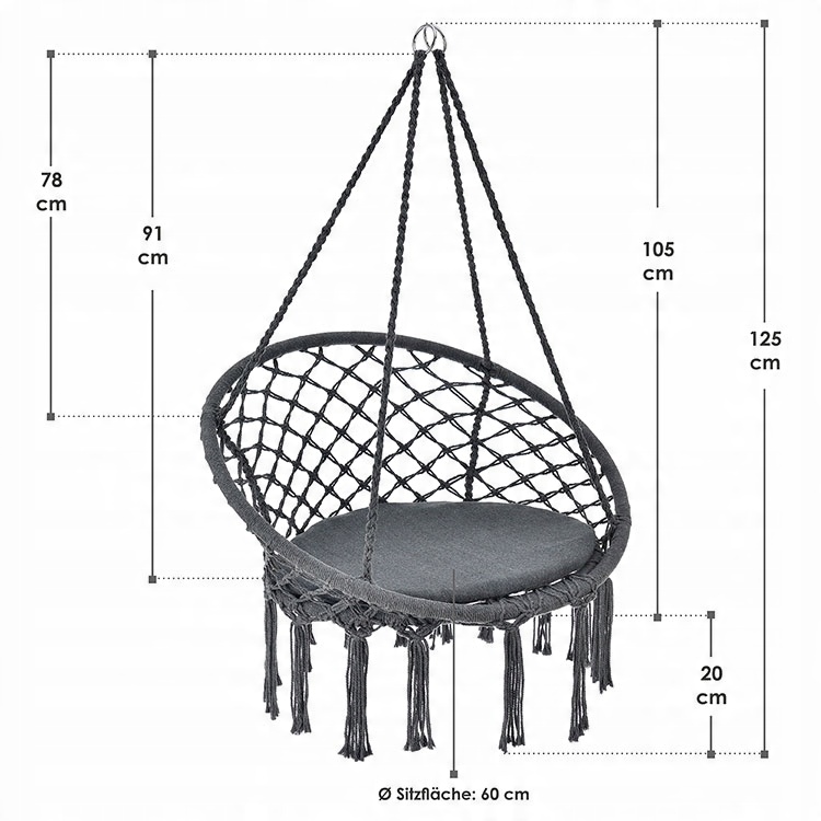 Наше подвесное кресло с подушкой антрацитового цвета не только невероятно шикарно, но и очень уютно. Благодаря уникальному узору макраме вы в моде. Подвесная корзина понравится и детям, и взрослым. Подвесное кресло идеально подходит для тех, кто любит гостиную и ищет приманку для использования в помещении. Наша подвесная корзина также является отличной и компактной альтернативой гамаку. Возьмите в руку свою любимую книгу и наслаждайтесь самыми прекрасными моментами на новых подвесных качелях.