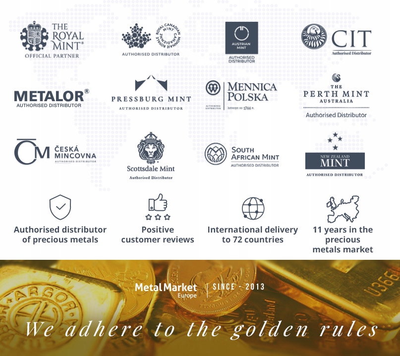Способ обеспечения актива указан в оферте продавца. Упаковка изделия является лишь средством защиты металла при транспортировке и рекламациям не подлежит. Дополнительную защитную упаковку, такую как колпачки/тюбики/коробки, можно заказать в разделе аксессуаров. В случае инвестиционных монет состояние монетного двора может также указывать на монеты с небольшими царапинами/вмятинами по краям, вмятинами на поверхности монеты или изменениями цвета, которые могли возникнуть уже на этапе производства. Молочные пятна и патина являются явлением, возникающим в процессе обработки серебра и не влияют на стоимость изделия. В случае слитков царапины на полированной поверхности являются естественным явлением, возникающим при прокатке металла при изготовлении прутка. Небольшие потертости по бокам и краям планки – это процесс «сбора» металла производителем с целью получения идеального веса предмета. Вышеуказанные факторы, непосредственно вызванные процессом производства или транспортировки, не являются основанием для рекламации на продукцию. При покупке 5 и более 5 штук одного и того же товара, он может быть отправлен в сборной упаковке – мятные тубы/мастербоксы. Поэтому данная продукция может не получить упаковку для транспортировки. Согласно ст. 38 п. 2 Закона от 30 мая 2014 г. о правах потребителей (сводный текст: Законодательный вестник от 2020 г., ст. 287, от 2021 г., ст. 2105, от 2023 г., ст. 2759), Клиент, являющийся Потребителем, не имеет права выход из Договора купли-продажи в связи с тем, что цена, установленная на Товар, зависит от колебаний финансового рынка, над которыми Продавец не имеет контроля и которые могут произойти до наступления срока выхода из договора. После выбора опции «Купить сейчас» и оплаты заказа отменить заказ невозможно, независимо от того, сколько времени прошло с момента оплаты.