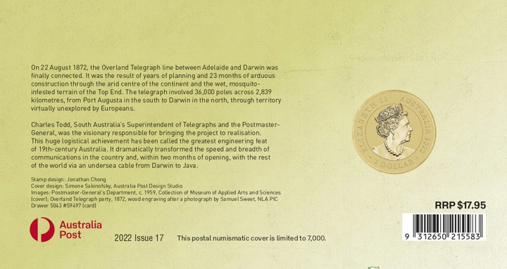 Монета «150-летие Австралийского сухопутного телеграфа из бронзы из алюминия» 2022 года изготовлена из алюминиевой бронзы, ее вес составляет 15,5 грамм, а максимальный диаметр - 30,6 мм. Ценность представляет и отмечает 150-летие создания первой австралийской телеграфной линии, которая соединяет север с югом Австралии, в частности город Дарвин с Порт-Огастой. Строительство закончилось в 1872 году. Эта уникальная монета представляет собой изделие с неограниченным тиражом. Продукт поставляется в оригинальных открытках, напоминающих открытку, и является законным платежным средством в стране эмитента. На него распространяется гарантия правительства Австралии. На аверсе изображен портрет королевы Елизаветы II. Все окружено надписью «ELIZABETH II», «AUSTRALIA» и информацией о году чеканки и номинальной стоимости монеты. Дизайн аверса разработал Ян Рэнк-Бродли. На реверсе изображена надпись «150-ЛЕТИЕ ЗАВЕРШЕНИЯ НАЗЕМНОГО ТЕЛЕГРАФА».