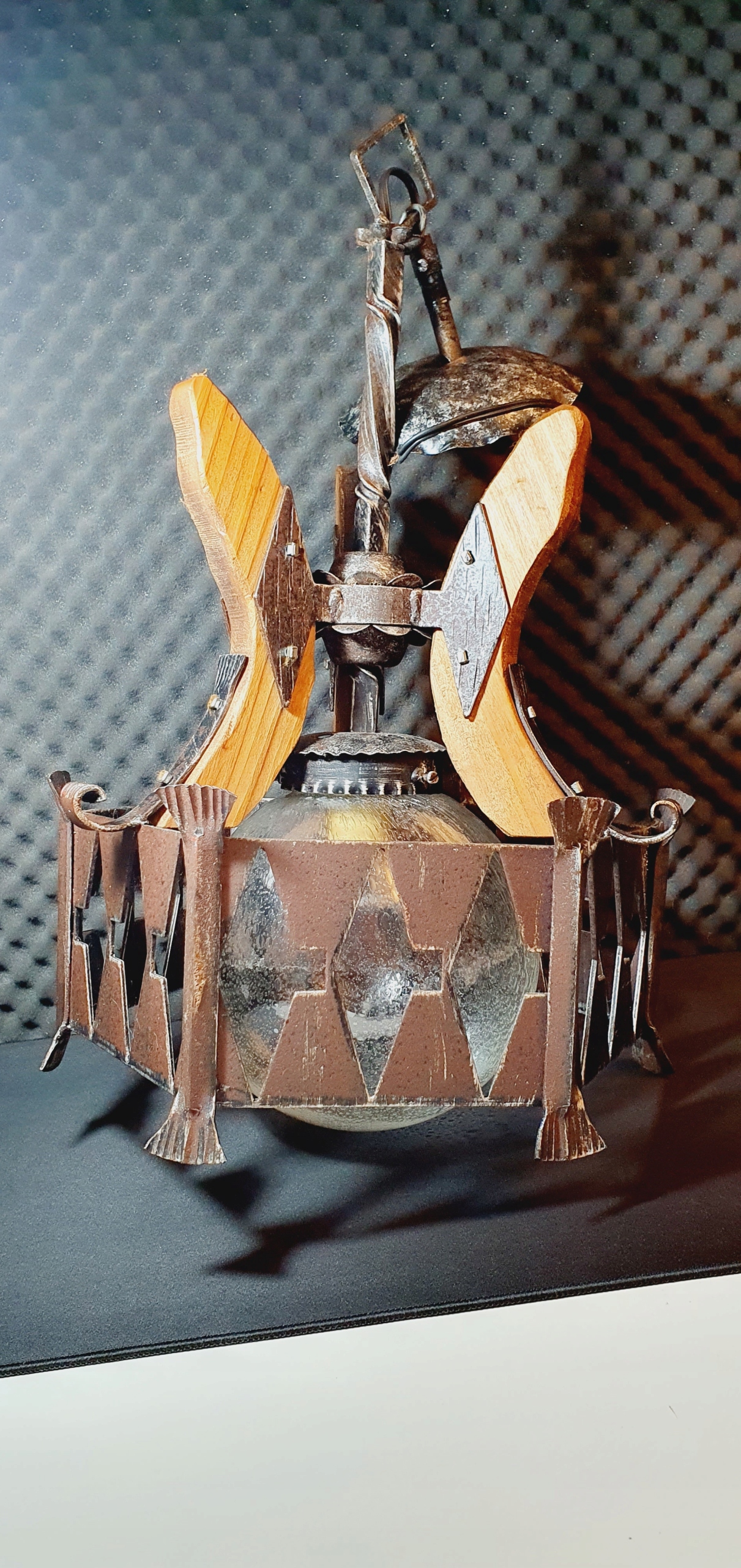 ЛЮСТРА СТАРАЯ КОВНАЯ, ЧЕРНАЯ С ДЕРЕВЯННЫМИ ЭЛЕМЕНТАМИ, ТЯЖЕЛАЯ, МАССИВНАЯ, ТРЕБУЕТ КОРРЕКЦИИ. ВЫСОТА 60 СМ, ДИАМЕТР СТЕКЛА - СТЕКЛЯННЫЙ ШАР 8,5 СМ, РАЗМЕРЫ МЕТАЛЛИЧЕСКОЙ ЧАСТИ ВОКРУГ ШАРА ШИРИНА 33 СМ, ВЫСОТА 14 СМ. Е-27 ЛАМПОЧКА. РАБОТАЮЩИЙ. ВИЗУАЛЬНОЕ СОСТОЯНИЕ НА ФОТО. РЕКОМЕНДУЕТСЯ.