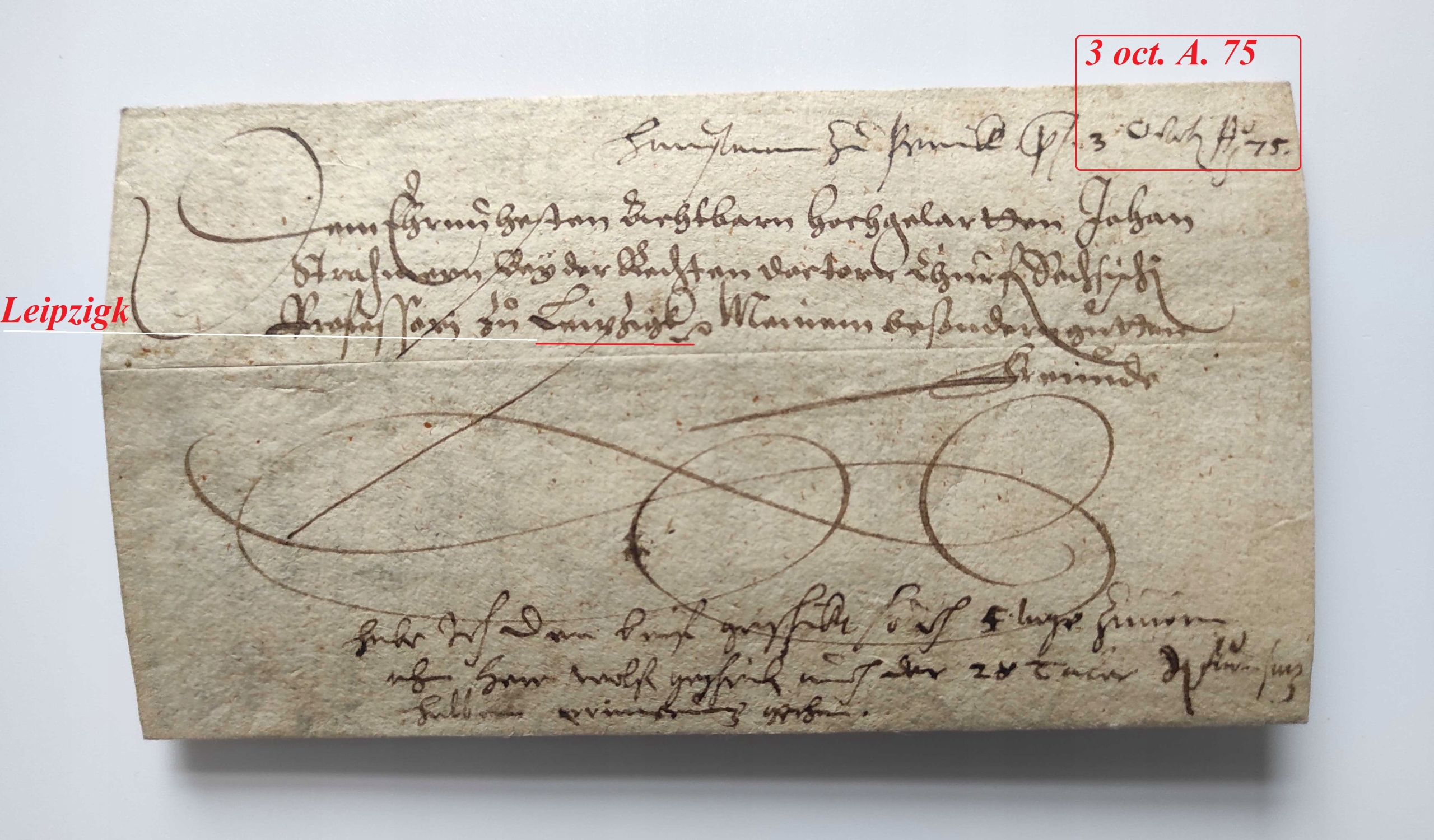 Уникальное письмо 1575 года с сохранившейся адресной страницей. Письмо на немецком Иоганну Штра...? в Лейпциге сохранился оттиск печати отправителя. Начало содержания письма обрезано. Почтовый интересный факт - письмо, написанное 1 октября 1575 г., дошло до адресата, вероятно, 3 октября 1575 г. Вероятно, об этом говорится в примечании на адресной странице. Дополнительные примечания внизу страницы адреса. Разрез открытки заклеен консервационной бумагой.