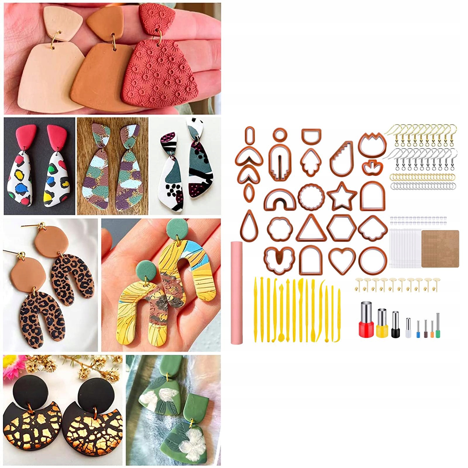 Различные формы и размеры: в комплект входят 24 формочки для сережек различной формы, 10 наборов карточек для сережек и самозакрывающихся пакетов, 10 наборов серег, 20 крючков для сережек, 30 переходных колец, 30 серег и 8 колец для литья форм, 1 шт. Валик xClay, 14 мини-инструментов для высечки.