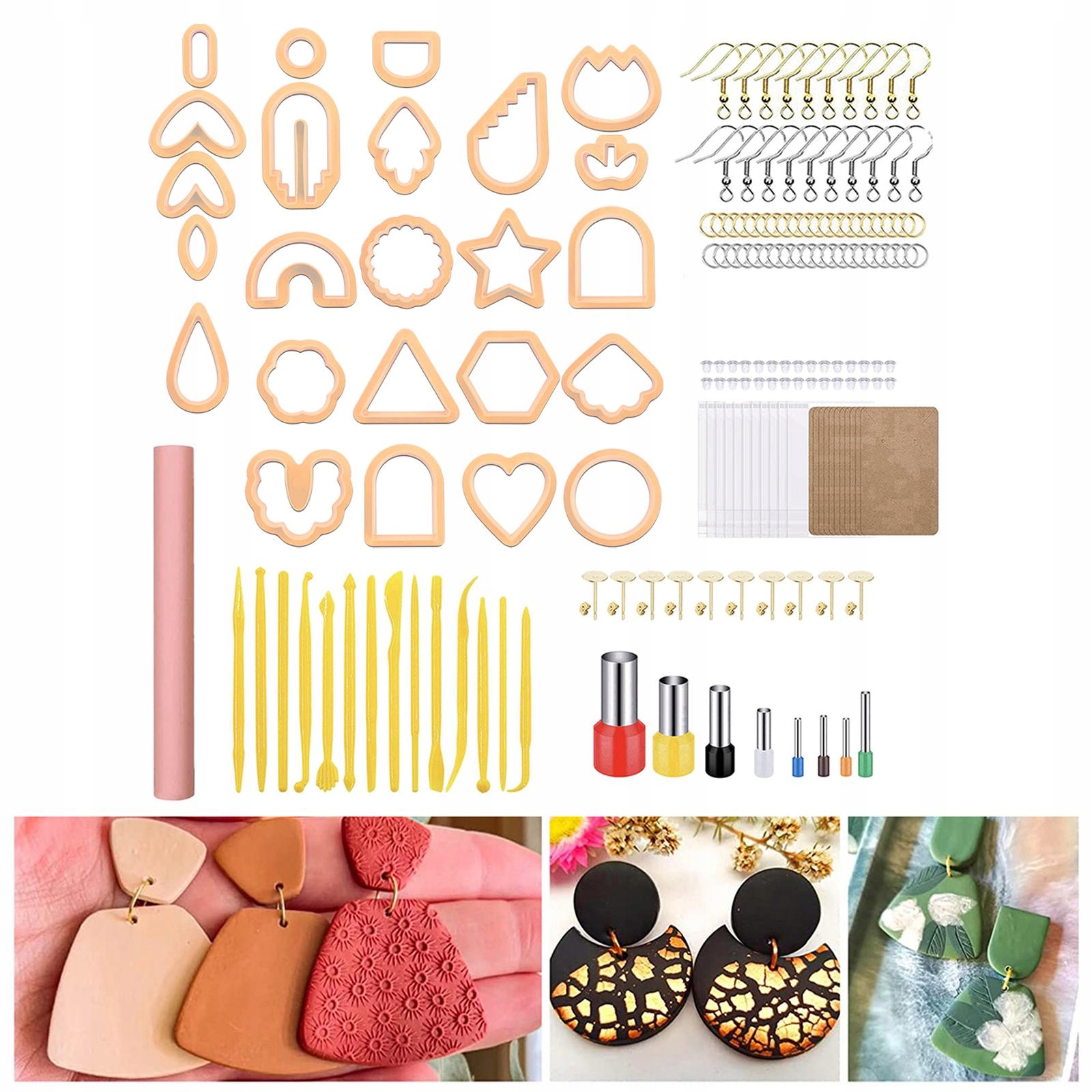 Различные формы и размеры: в комплект входят 24 формочки для сережек различной формы, 10 наборов карточек для сережек и самозакрывающихся мешочков, 10 наборов шпилек для сережек, 20 крючков для сережек, 30 серег, 30 оправок для сережек и 8 отливок для вырезания круглых форм, 1 глиняный валик, 14 мини-инструментов для резьбы.
