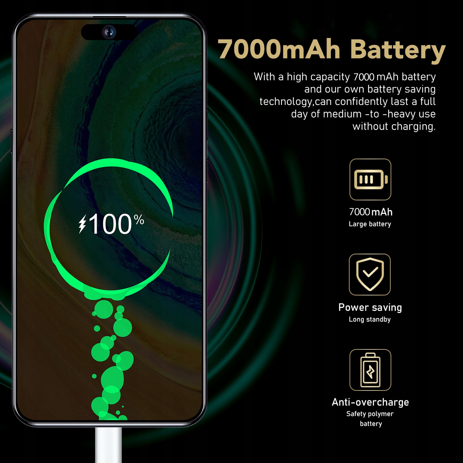 4. Большая емкость аккумулятора. Смартфон оснащен аккумулятором емкостью 7000 мАч и обеспечивает впечатляющее время автономной работы. Наслаждайтесь до 20 часов разговора, 18 часов воспроизведения музыки и 6 часов игр. Интеллектуальное управление аккумулятором с помощью искусственного интеллекта эффективно уменьшает переполнение кэша, экономит электроэнергию и продлевает время работы в режиме ожидания.