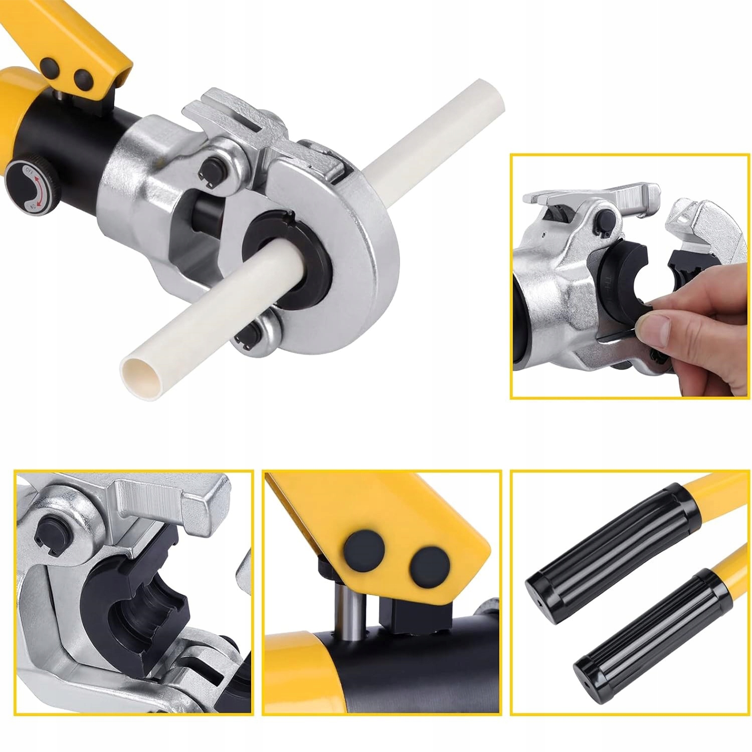 Handy Hydraulic Clamp - это надежный инструмент, предназначенный для зажима PEX, PB и медных труб с силой давления до 8 тонн . Оснащенная вращающейся головкой 360 ° и набор f в размерах от 16 до 32 мм , обеспечивает точные и быстрые соединения в водолазах и сточных водах и установках отопления. 360 °
