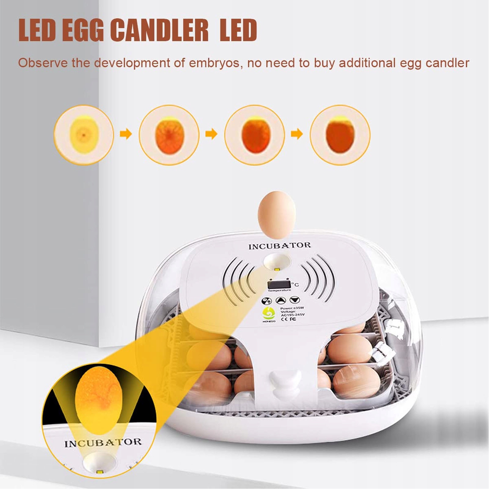 1. Автоматическая яичная свеча и светодиодные яйца: инкубатор для яиц может автоматически переворачивать яйцо каждые 2 часа, обеспечивая равномерный нагрев яйца, избегая прилипания между яичной скорлупой и лотком для яиц и улучшая скорость вывода. Функция автоматического вращения также может уменьшить количество прикосновений вручную, помогая поддерживать гигиену и предотвращая рост бактерий. Кроме того, для наблюдения за развитием яиц используется встроенная свеча.