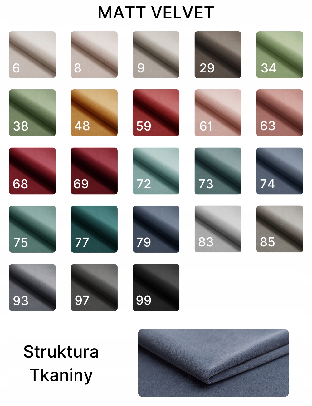 Обивка кровать -кровать Торро сделана из элегантной велюровой ткани, которая впечатляет мягкостью и тонким блеском. Велюр не только добавляет класс и уюту к интерьеру, но и подчеркивает современный характер мебели. Выберите из широкого спектра цветов, чтобы идеально соответствовать кроватью с вашим интерьером.