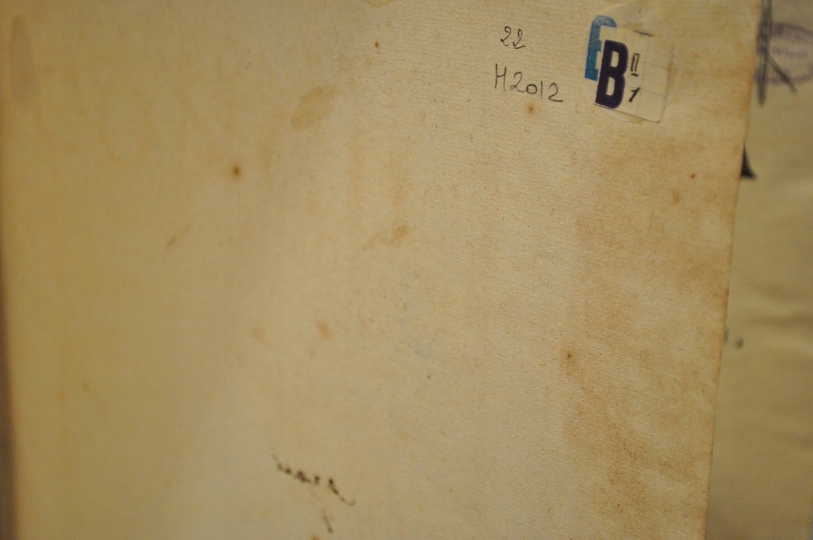 Аннотации ( карандаш, мелок, ручка), штамп и наклейка на лицевых форзацах.