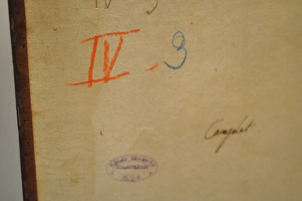Аннотации на верхнем поле титульного листа на латинице и два штампа собственности.