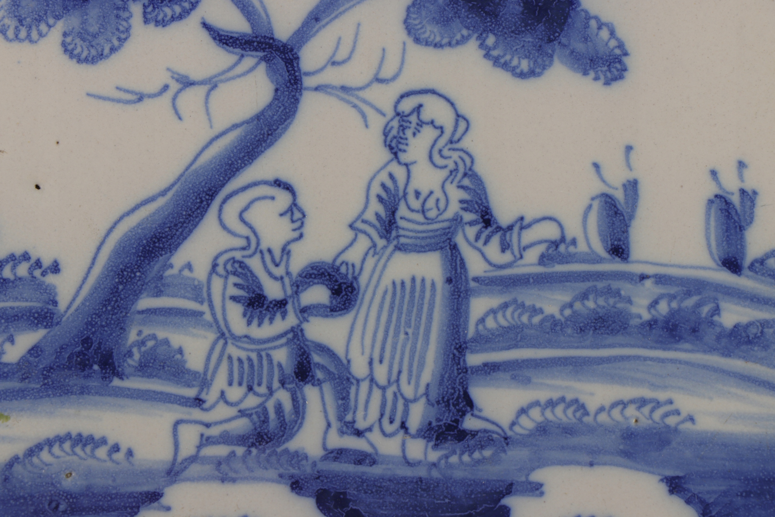 Кобальтовая плитка Delft, расписанная вручную. На плитке изображена жанровая сцена. Предлагаю и другие подобные плитки на других аукционах.