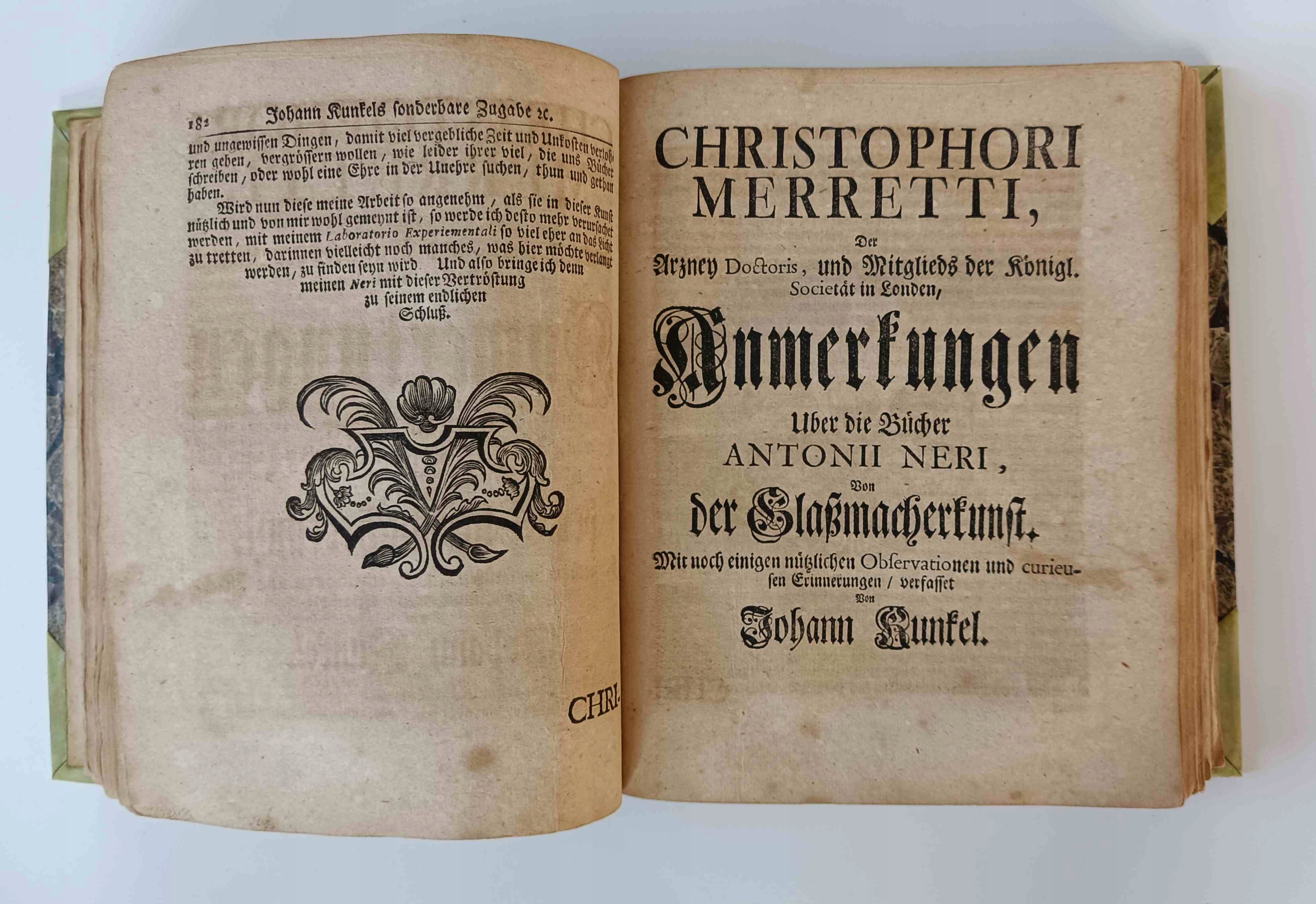Иоганн Кункельс Churfürstlich Brandenb. Wirklich bestallten geheimden Cammerdieners, vollständige Glaßmacherkunst : worinnen sowol dessen Erläuterungen über Anton Neri sieben Bücher von dem Glaßmachen und Dr. Merrets hierüber gemachte Anmerkungen als auch eine Grosse Anzahl nützlich und angenehmer Versuche nebst einem Anhang von den Perlen und Edelsteinen enthalten sind.