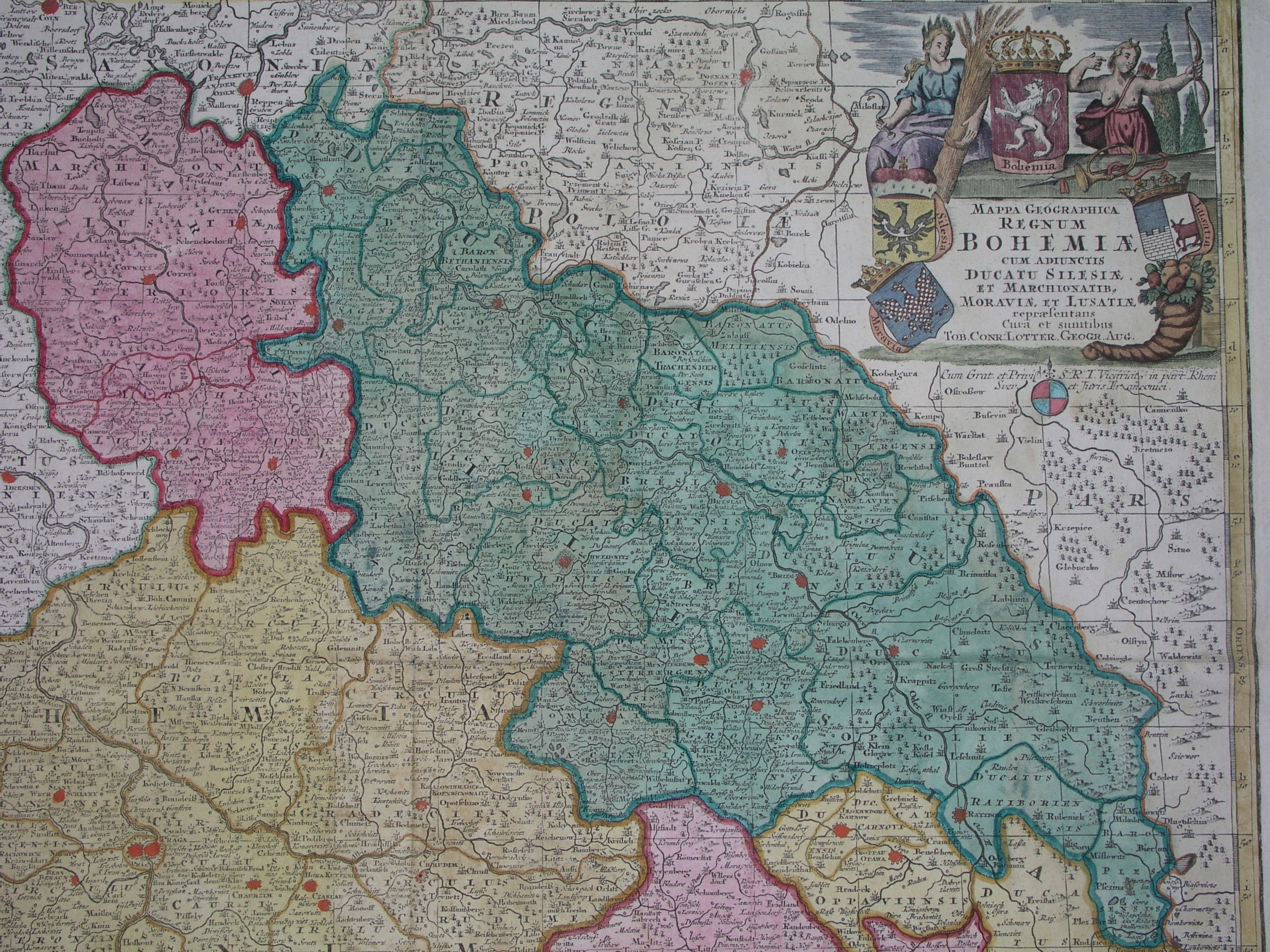 ДЕКОРАТИВНАЯ, ОРИГИНАЛЬНАЯ ОБЩАЯ КАРТА КОРОЛЕВСТВА ЧЕХИЯ из атласа Тобиаса Конрада Лоттера под названием «Atlas Geographicus...», изданного в Аугсбурге в 1759 году. Это гравюра на медной пластине, раскрашенная вручную линейно и плоскоцветная, отпечатанная на листе ребристой бумаги ручной работы со сгибом атласа. Карта снабжена декоративным картушем с названием карты и гербами земель, входящих в состав Королевства, а также еще одним картушем меньшего размера с двумя линейными масштабами. ----- Размер копии примерно 60 на 52 см (включая поля примерно 1,5 см). ------ Состояние: лист обрезан почти до рамки, видны пятна и продольный сгиб карты.
