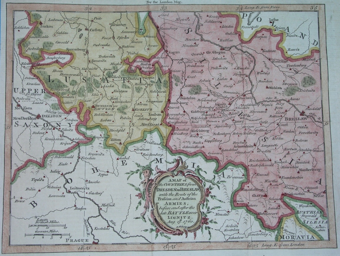 ОРИГИНАЛЬНАЯ КАРТА НИЖНЕЙ СИЛЕЗИИ и ЛУЗИТИИ, показывающая маршруты прусских и австрийских войск из окрестностей Саксонского Дрездена, предшествовавшие битве при Легнице 15 августа 1760 года. (так называемая Семилетняя война). Карта, составленная Томасом Китчином, опубликованная в английском журнале для элиты под названием «The London Magazine», Лондон, 1760 год. Это раскрашенная вручную медная гравюра, напечатанная на карточке из тонкой ребристой бумаги ручной работы, снабженной декоративным картушем с названием карты и двумя линейными масштабами, без печати на оборотной стороне; карточка сложена вдвое по размерам этого небольшого журнала.----- Размер карты примерно 22,5 на 17,5 см, открытки примерно 25 на 20 см. ------- Карта в очень хорошем состоянии (края слегка загрязнены). РЕДКО ЗВУЧАЕТСЯ НА ПОЛЬСКОМ АНТИКВАРНОМ РЫНКЕ!