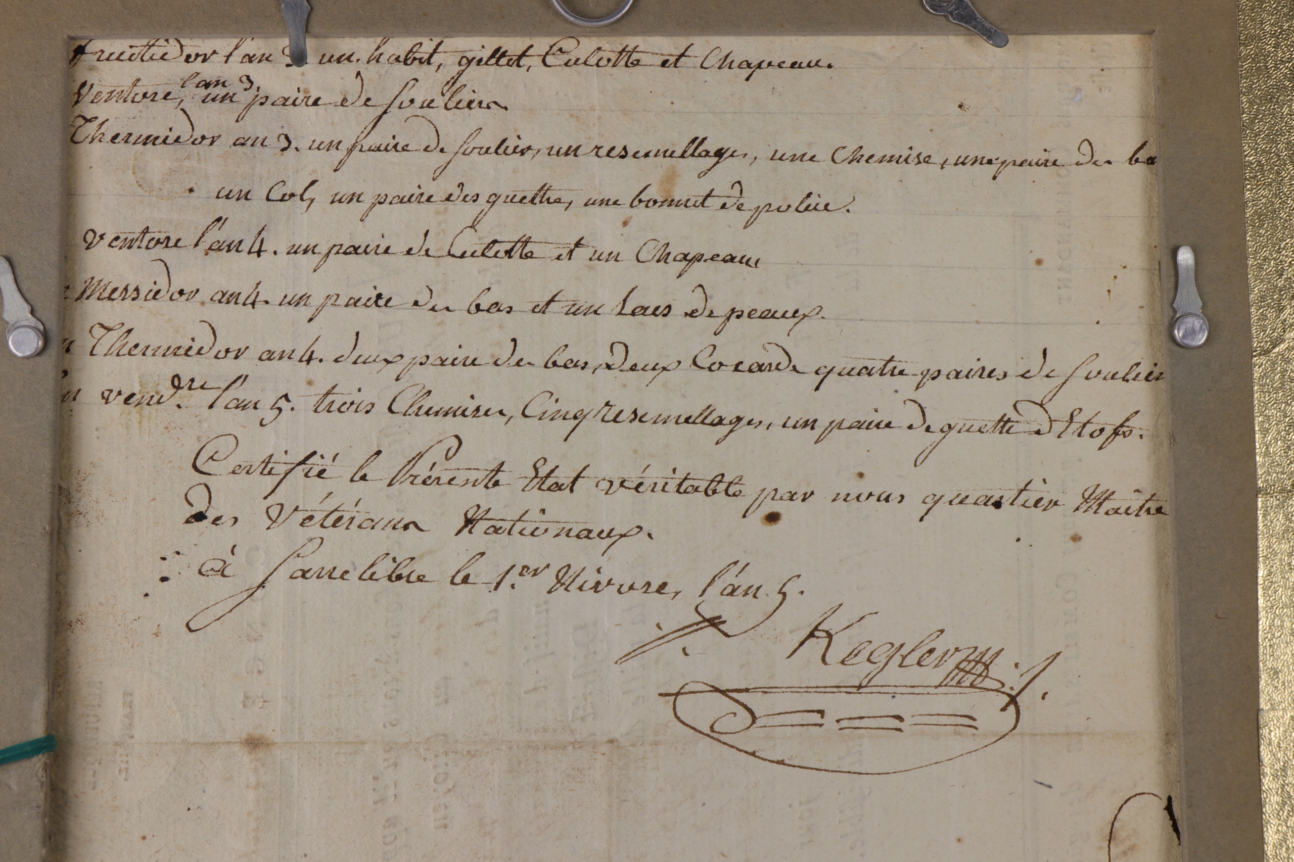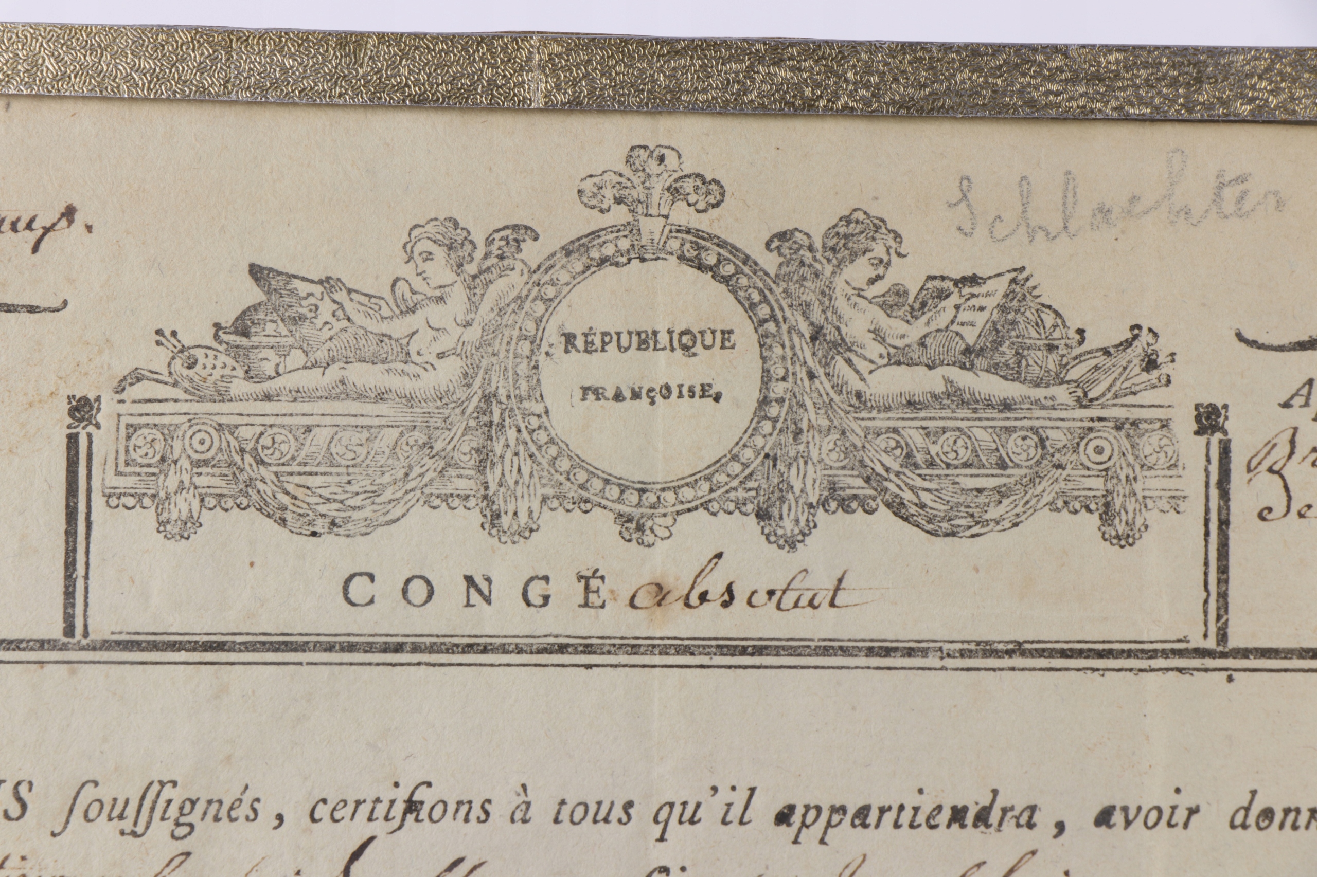 Интересный документ: Conge absolut, т.е. акт абсолютного увольнения из армии. Документ, выданный в 5-м году республики, т.е. 1796/1797, на гражданина Якоба Хаима, сержанта 126-й роты, родившегося в Марли. Документ с сургучной печатью Французской Республики.