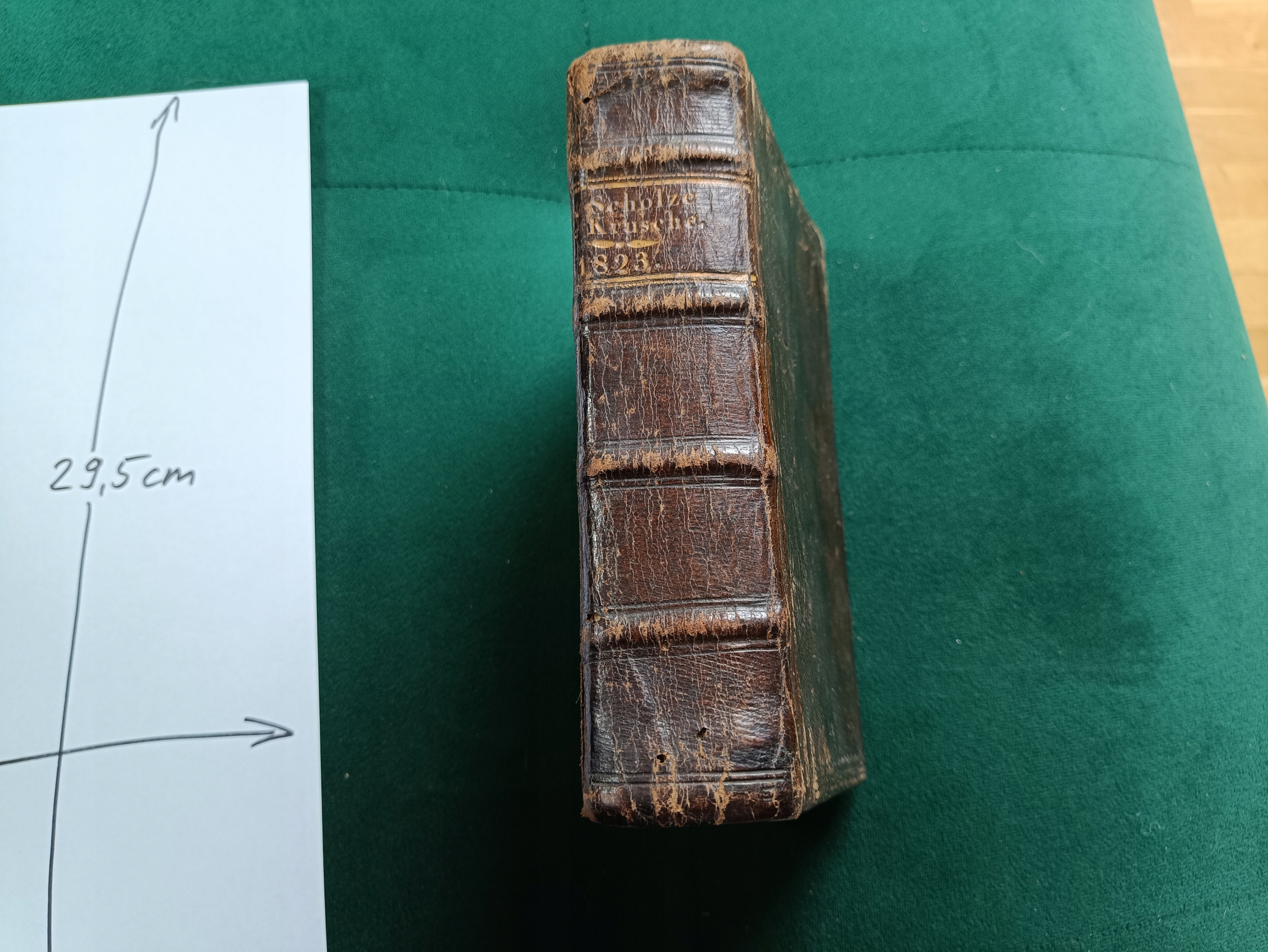 Размер карты с панорамой ок. 25 х 16 см, размер самой печати ок. . Переплет кожаный, края карточек позолочены с тиснением. На корешке мы видим надпись: Scholze Krusche 1823. Старый оттиск восстановлен - это видно на задней обложке. На пустой странице перед панорамой имеется фрагмент водяного знака, который может указывать на бумажную фабрику в Подгужине - возможно, это изделие Беньямина Готлиба Альтмана, который был ее владельцем с 1818 года (что соответствует дате переплета - 1823 год).
