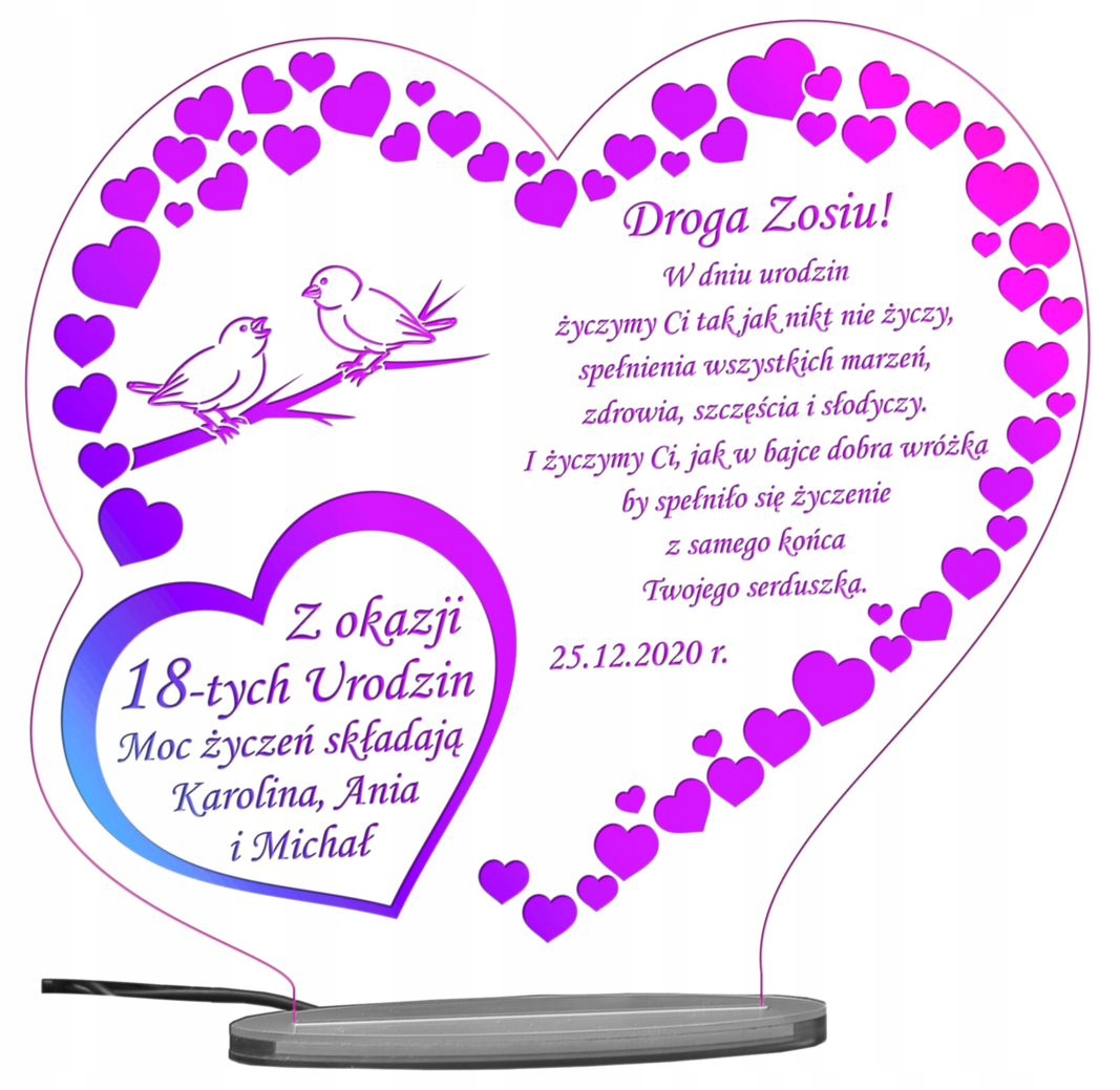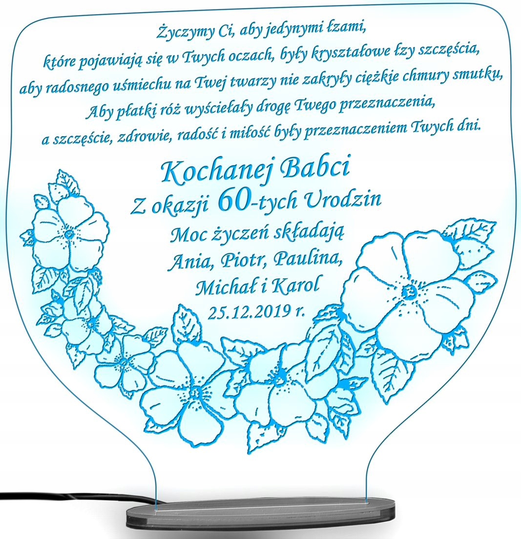 Предлагаем уникальные световые статуэтки на дни рождения и именины. Статуэтки изготовлены из качественного прозрачного акрила толщиной 5 мм с белой гравировкой. После включения подсветки гравировка загорается выбранным вами цветом. Питание статуэтки осуществляется от стационарного блока питания, прикрепленного к статуэтке.