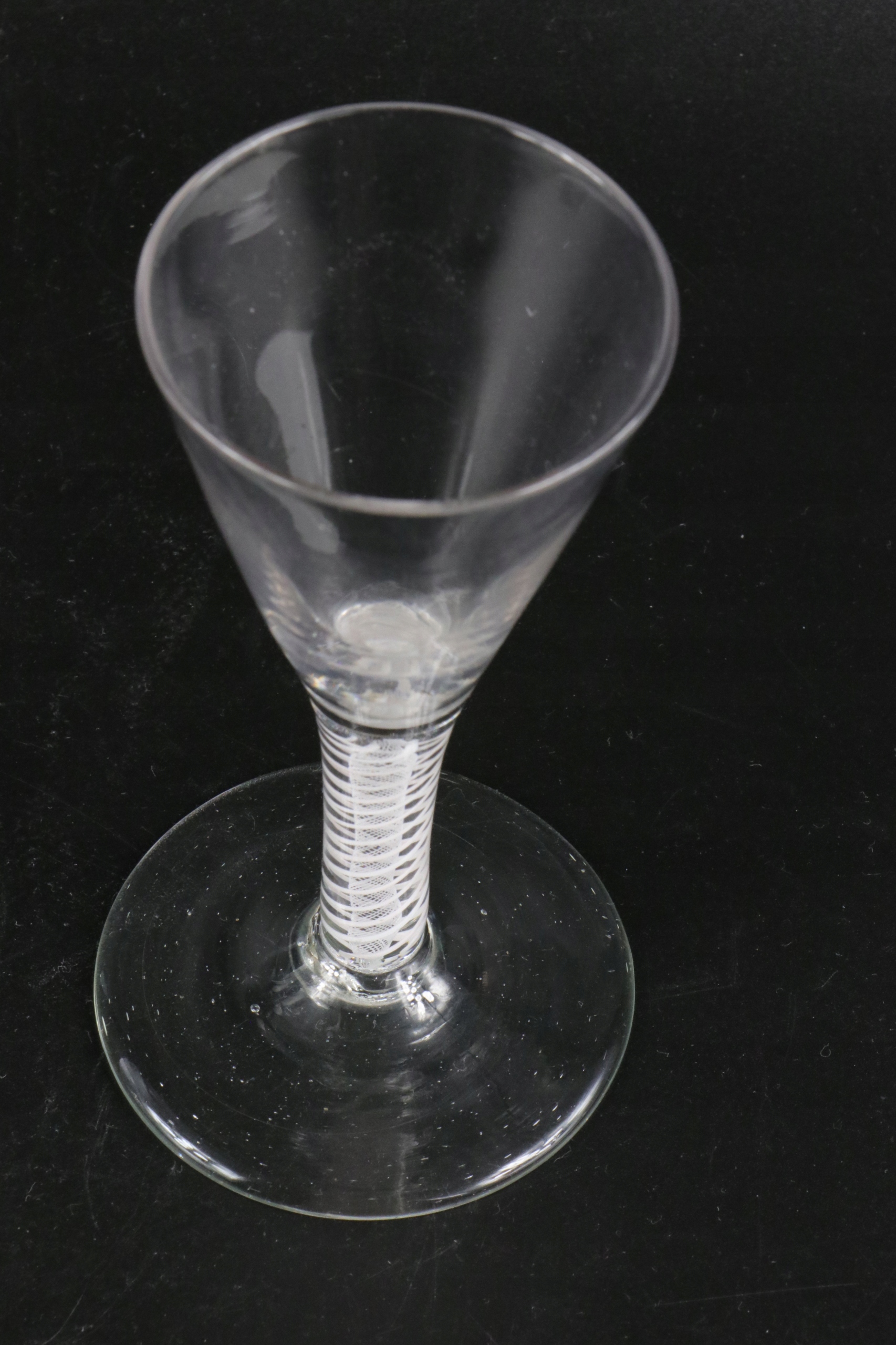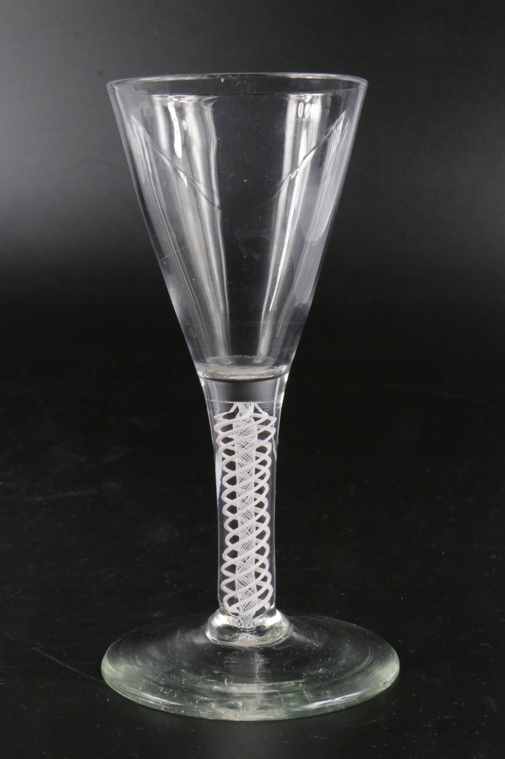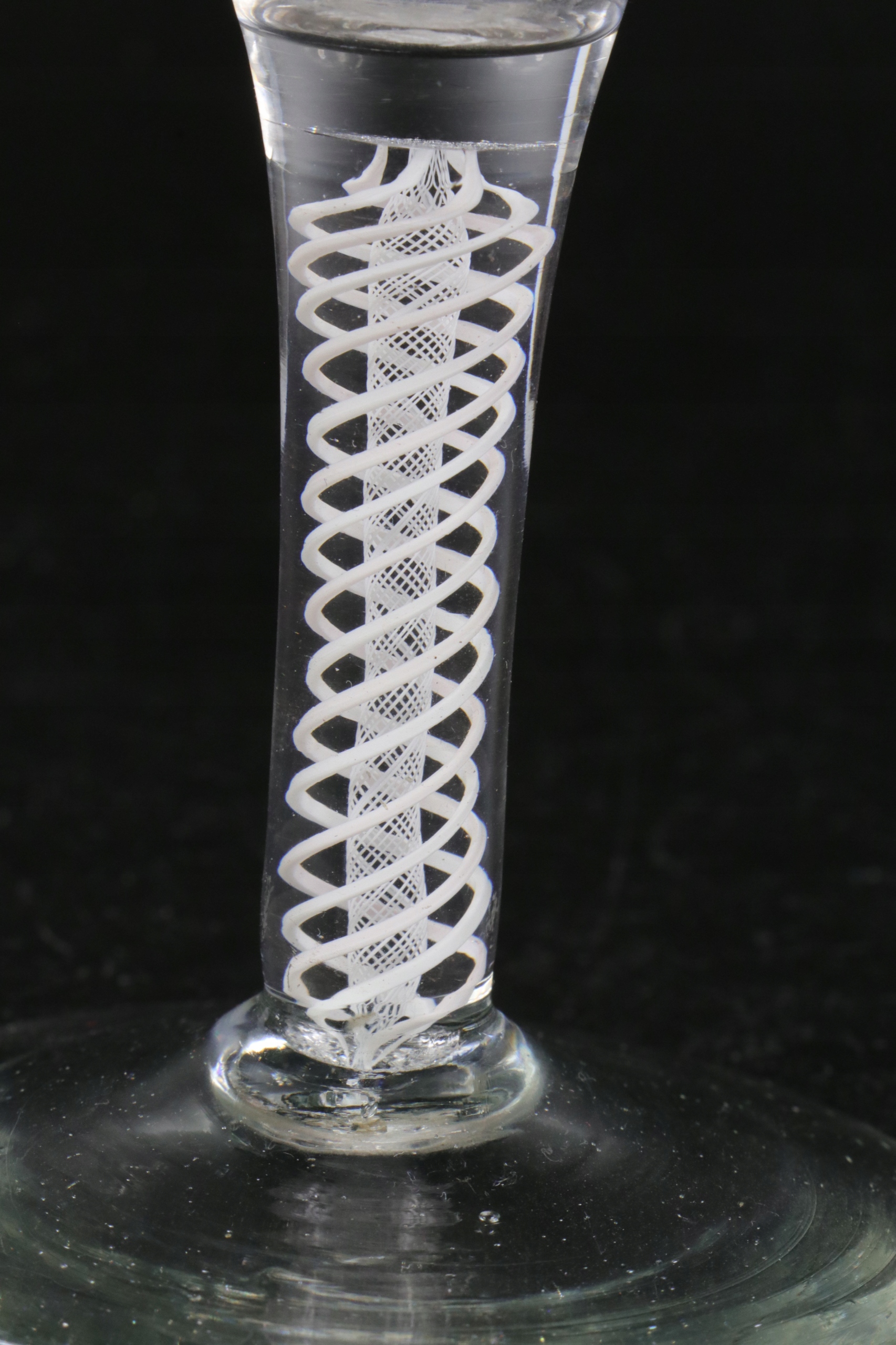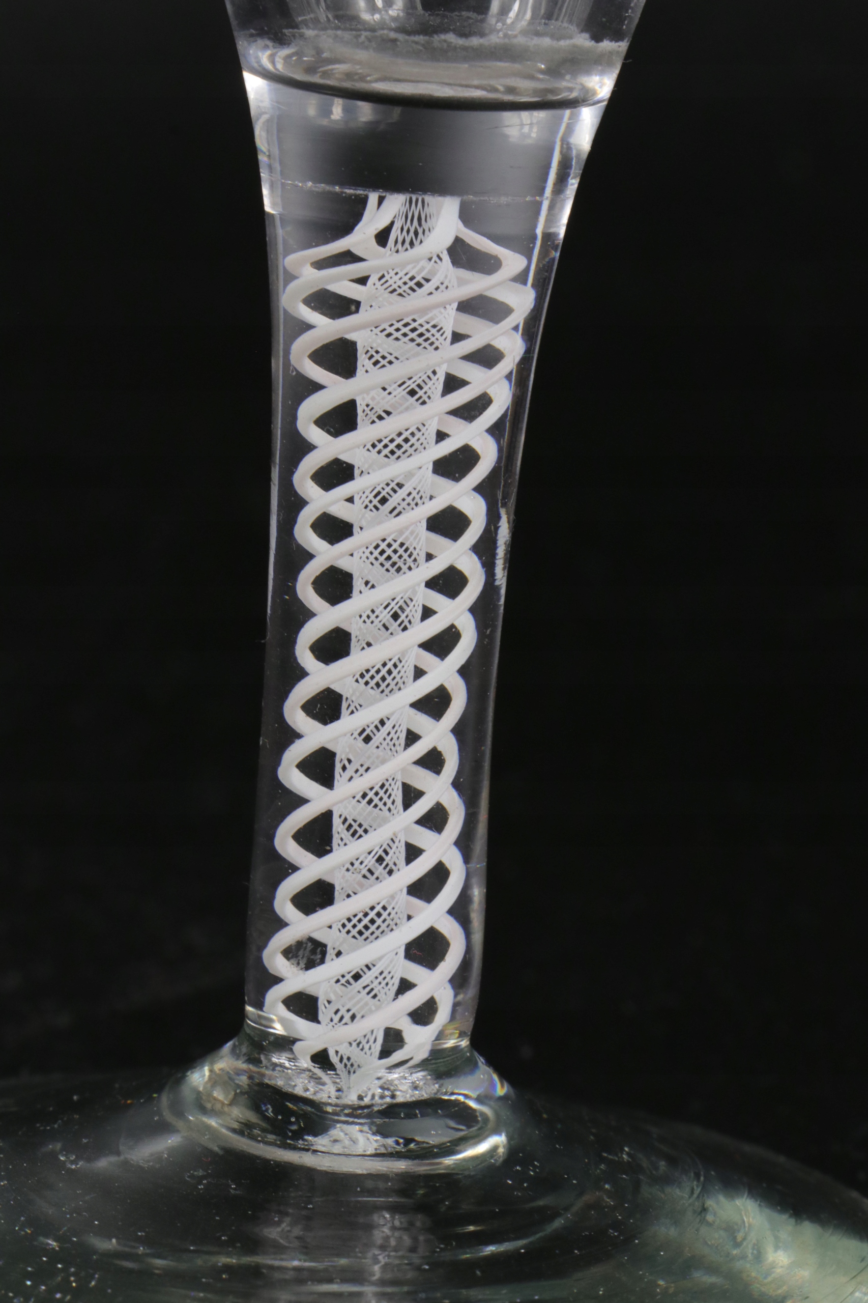 Очень интересный стакан XVIII века, ножка которого украшена вкрапленной сеткой из равномерно скрученных стеклянных нитей. Стакан ручной формы. В ножку стакана вделаны нити белого стекла, внутренний слой более плотный и тонкий, внешняя оплетка выполнена из нитей более толстого стекла, все заделано в прозрачное стекло. Английское стекло. Непрозрачное поворотное стекло. Якобитовое стекло. Предлагаю второй аналогичный бокал на другом аукционе.