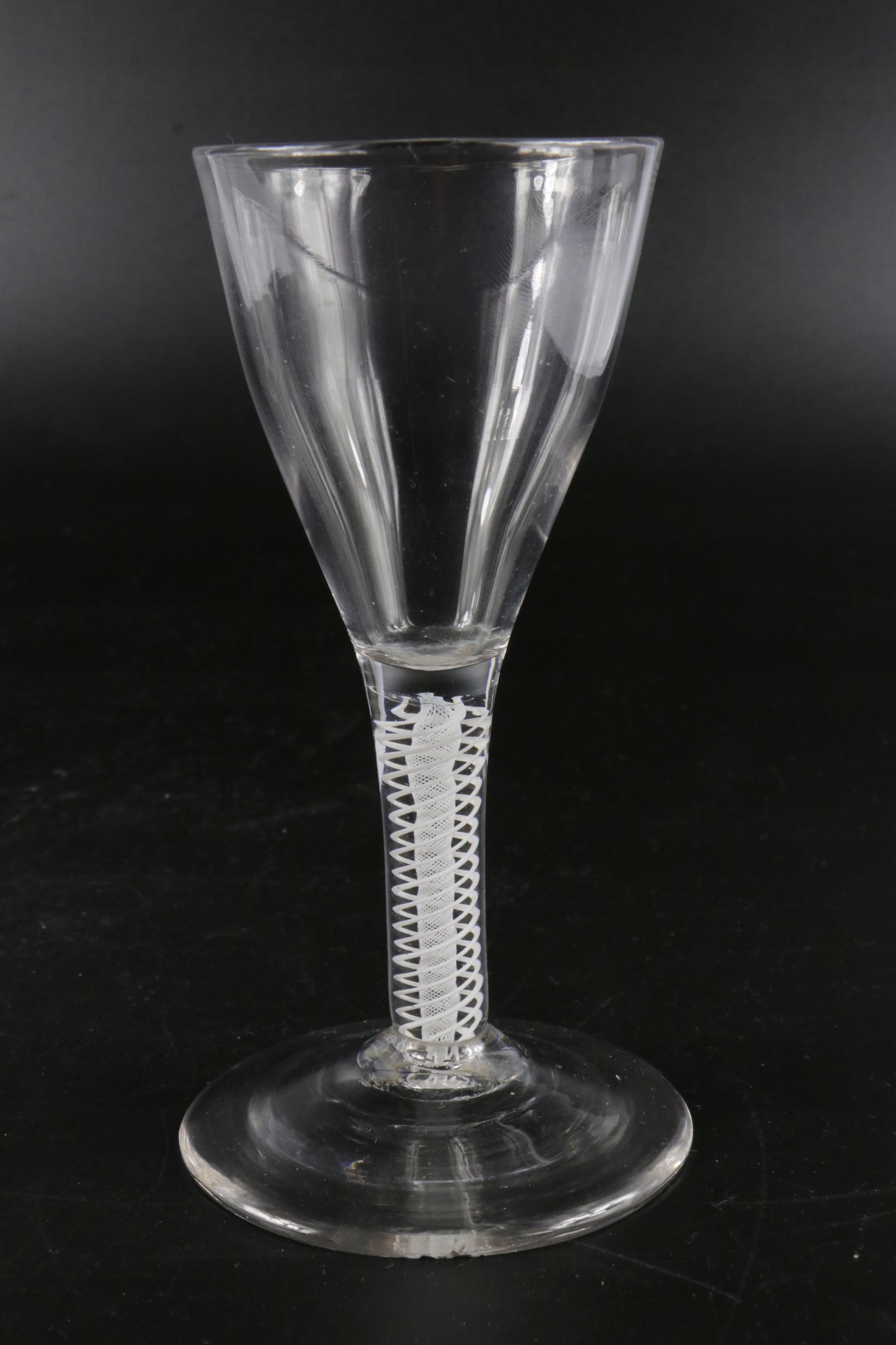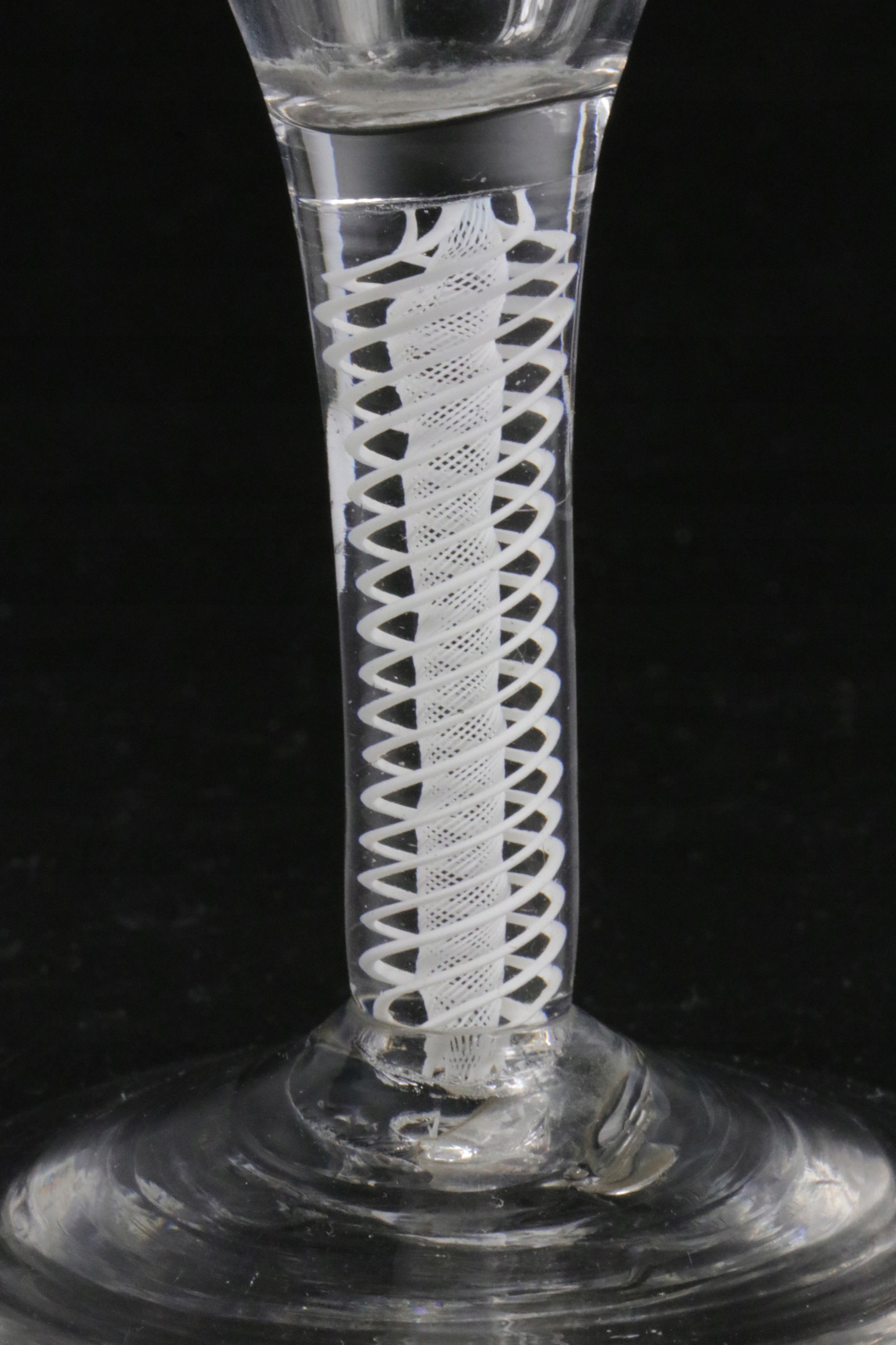 Очень интересный стакан XVIII века, ножка которого украшена вкрапленной сеткой из равномерно скрученных стеклянных нитей. Стакан ручной формы. В ножку стакана вделаны нити белого стекла, внутренний слой более плотный и тонкий, внешняя оплетка выполнена из нитей более толстого стекла, все заделано в прозрачное стекло. Английское стекло. Непрозрачное поворотное стекло. Якобитовое стекло. Предлагаю второй аналогичный бокал на другом аукционе.