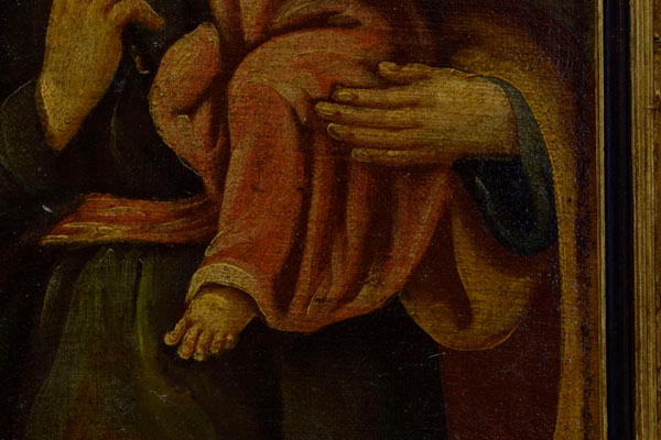 Старая картина маслом, написанная на холсте, наклеенная на доску. На картине изображен Святой Иосиф с Младенцем.