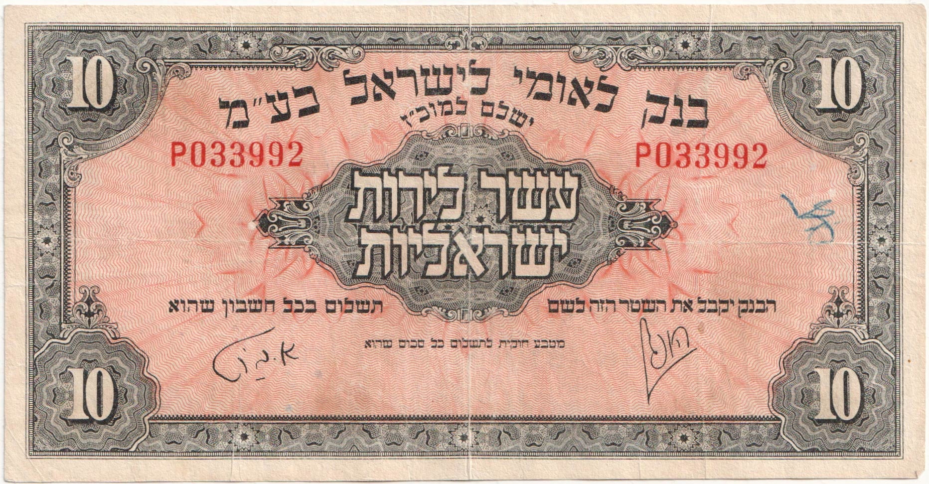 18.дб.Израиль, 10 фунтов 1952 г. редкая, Р.22.а, Ст.3+