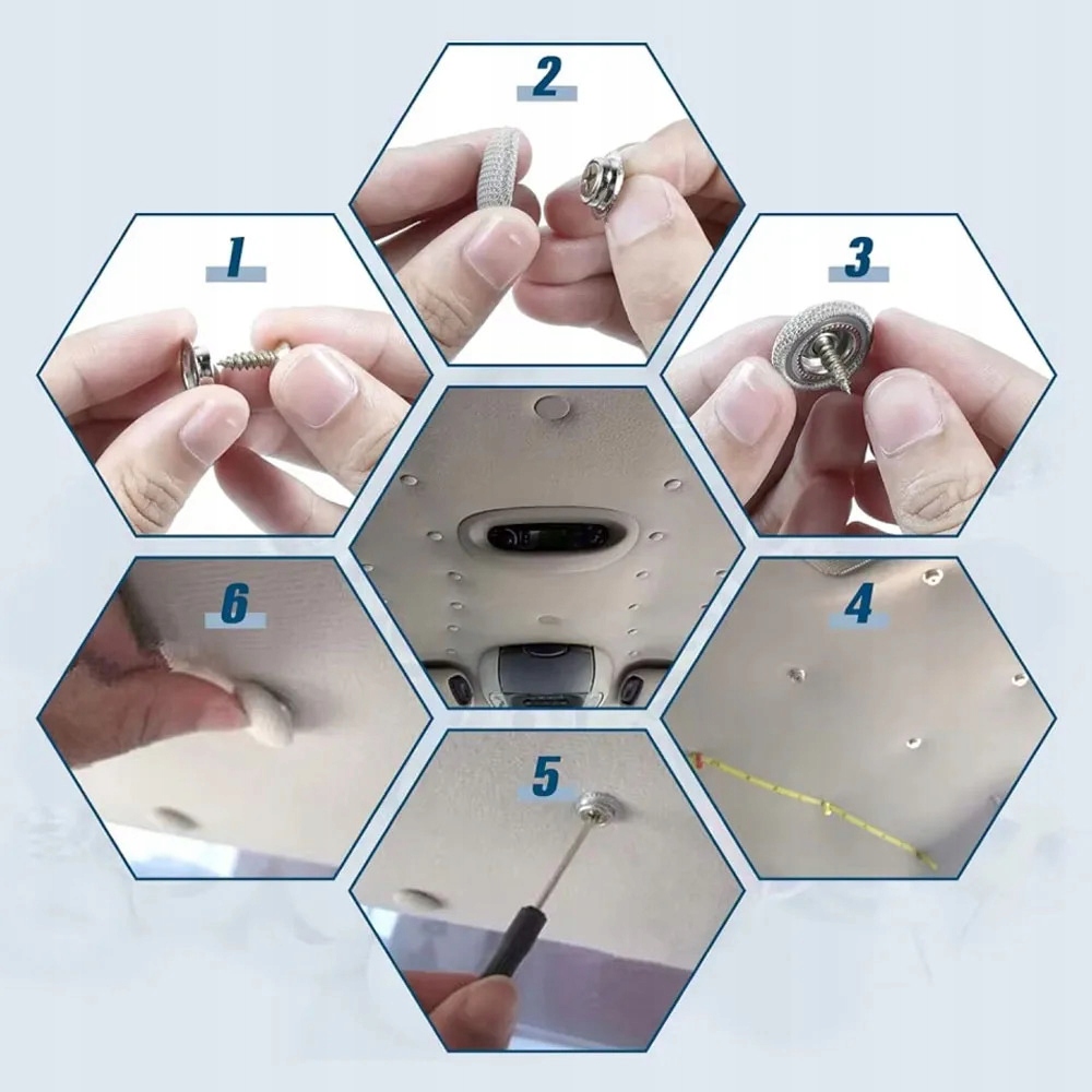 - ✔ Эффективный набор, который выполняет свою задачу - заклепки крепко удерживают материал, восстанавливая оригинальный внешний вид хедлайнера и обеспечивая влияние профессионального ремонта, как из мастерской, благодаря которой хедлайнер не видит и выглядит как новый