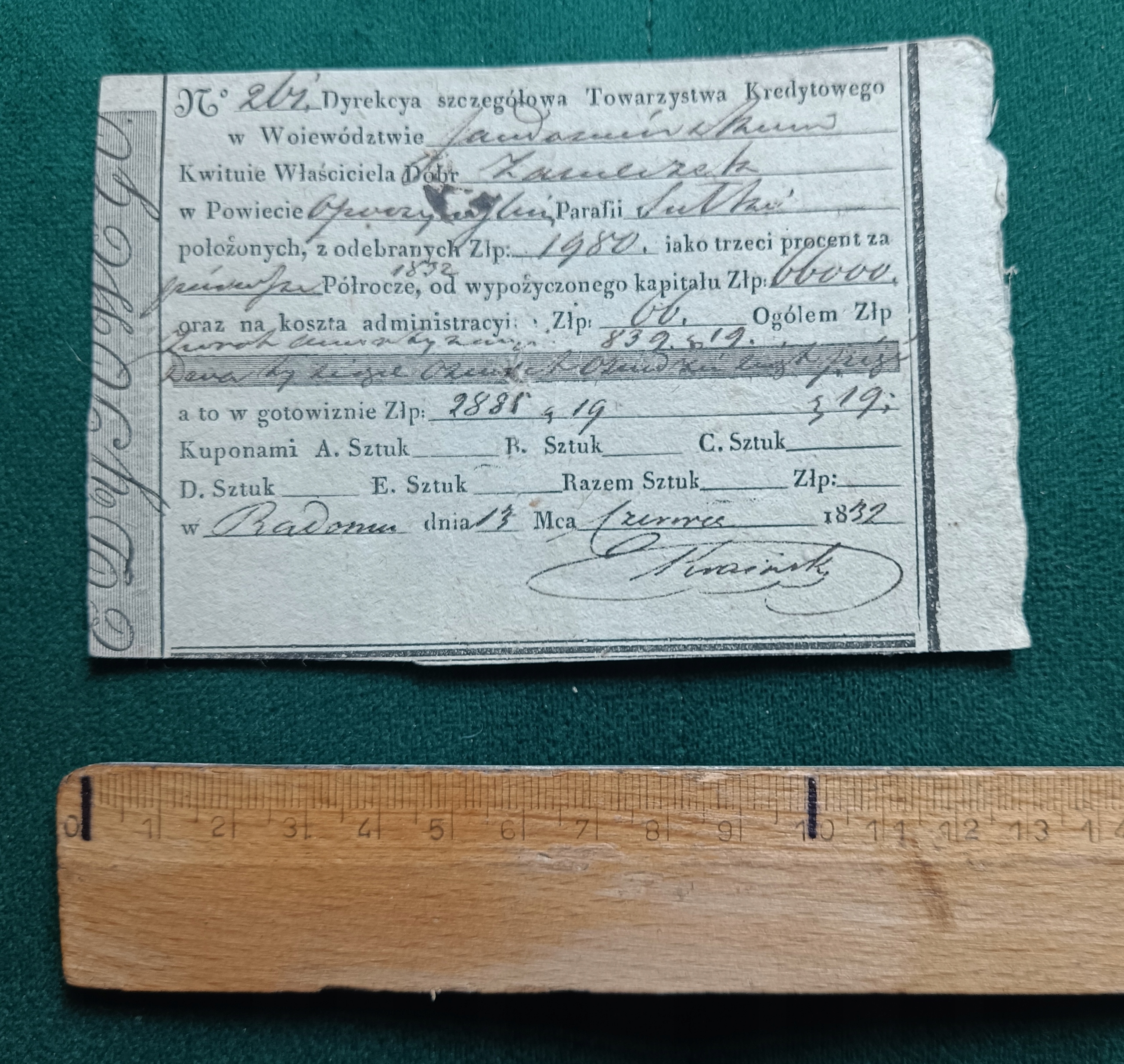 Небольшая, но интересная квитанция 1832 года, выданная владельцу поместья Замечеков. Интересный принт, на котором указано, была ли оплата произведена наличными или купонами.