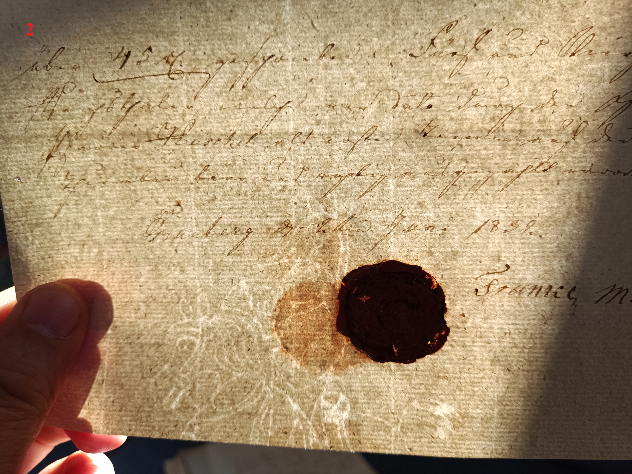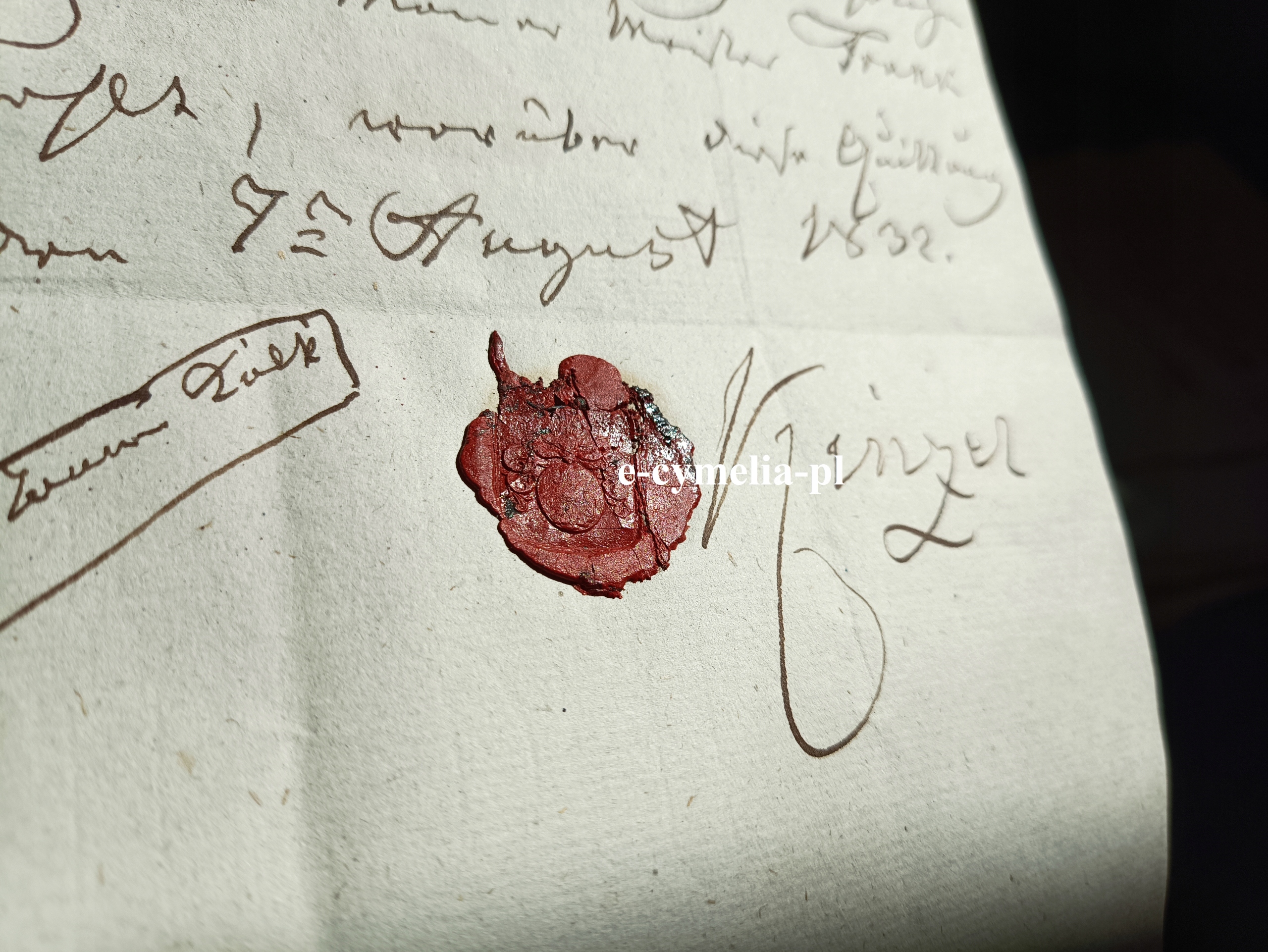 <р>1. Anno 1832 (...) Auf der Raths-Waage der Konigl. Пройсс. Stadt Grunberg Hat Wiegen lassen:... квитанция из городского масштаба. <р>2. Рукописная квитанция о доставке извести мастеру-каменщику Франке, выданная 7 августа 1832 года в Кунуве - вероятно, Кюнау - сегодня Хынув - районе Зелёной Гуры. Восковой штамп эмитента, не очень разборчивый. Бумага ручной работы с водяным знаком JCB SAENITZ — продукция бумажной фабрики Sanice — инициалы указывают на тогдашнего владельца Иоганна Кристиана Борсдорфа. <р>3. Рукописная квитанция, выданная в Грюнберге-Зеленой Гуре в 1832 году мастером-каменщиком Франке. В квитанции указывается сумма, вид работы, место и дата надписи и подпись каменщика: Франке М. Майстер (т. е. Franke Master Bricklayer). Под подписью овальная сургучная печать — по ободку надпись Francke M M (сокращение от MaurerMeister). Квитанция, написанная на бумаге ручной работы с фрагментом водяного знака - форейтора на лошади. Чеки мастеров с сургучными печатями встречаются довольно редко.Цена за комплект из 3-х квитанций.
